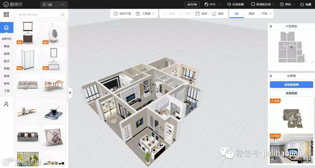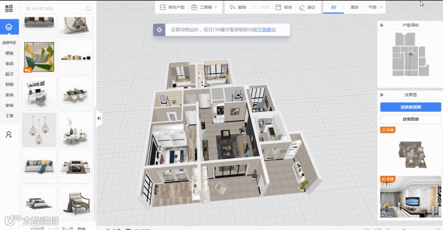 装修工具主要进行软装搭配及做简易的硬装设计,除定制的橱柜衣柜外,家具的选择与放置均是在这个工具完成的。