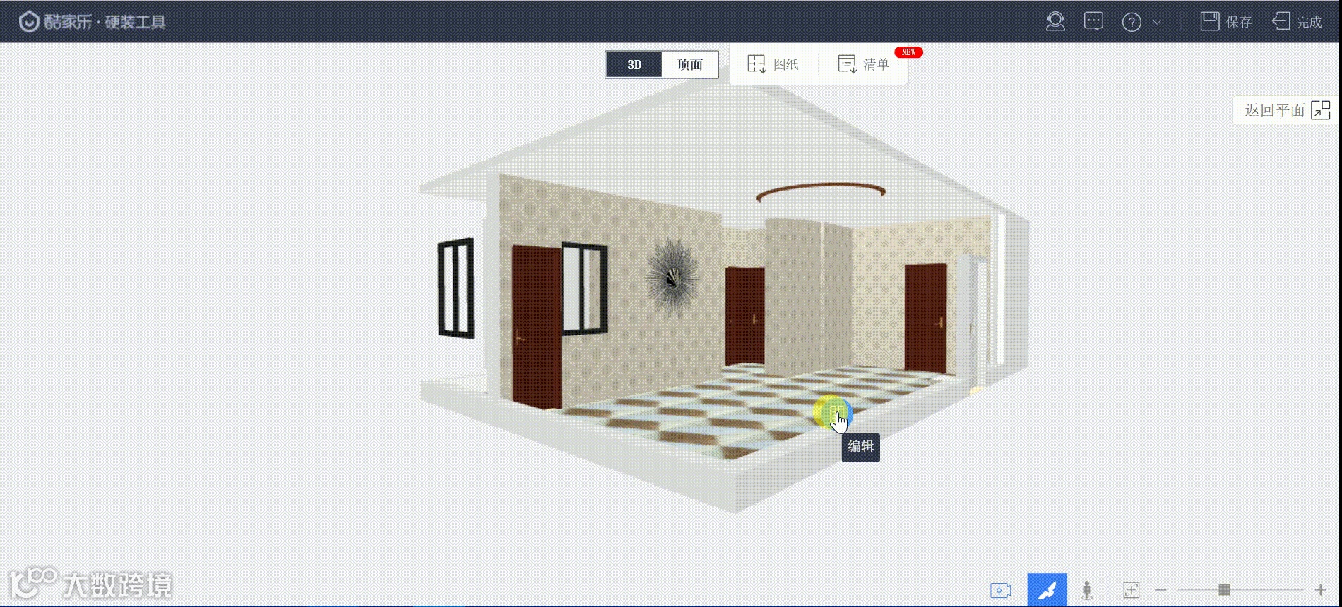 如果要对墙面、地面和吊顶做比较高级的设计,您可以直接点击目标、也可以通过“工具箱”进入酷家乐硬装工具,包括墙面工具、地面工具、吊顶工具,如下图;