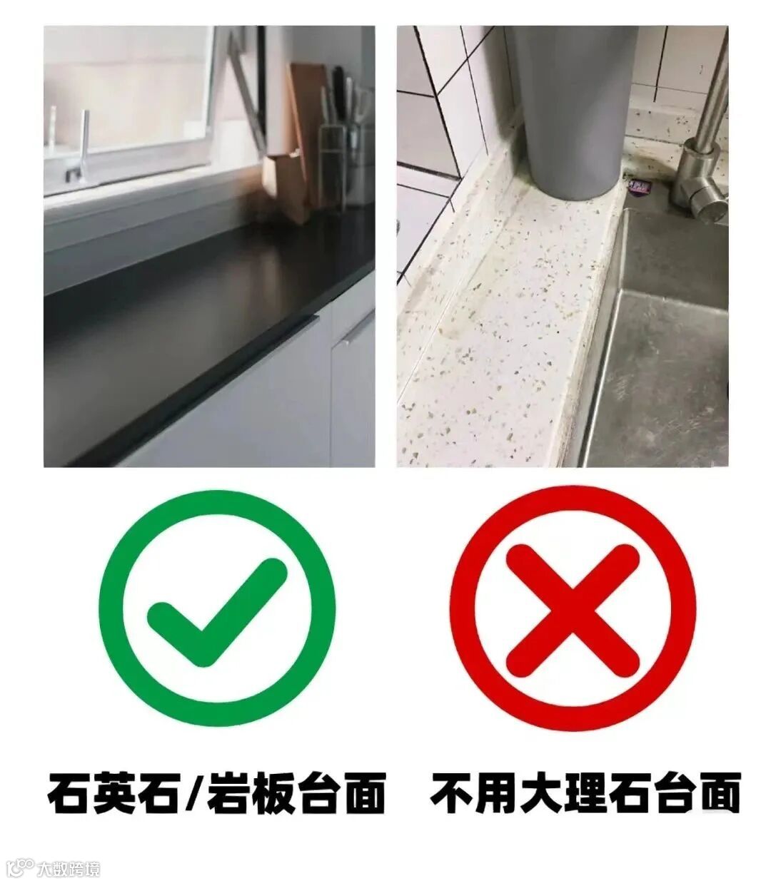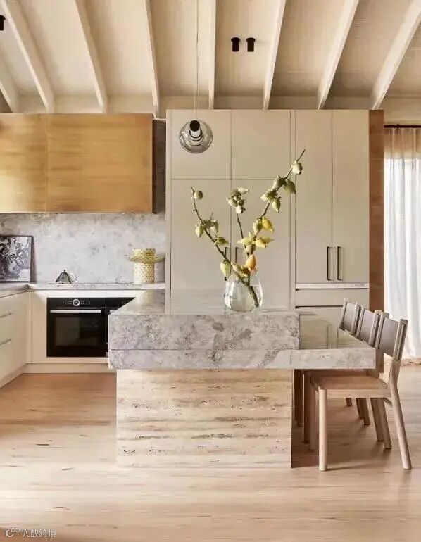 台面要选择岩板和石英石,不用大理石台面,因为岩板和石英石的硬度更高,更耐磨防渗透,不容易变色。