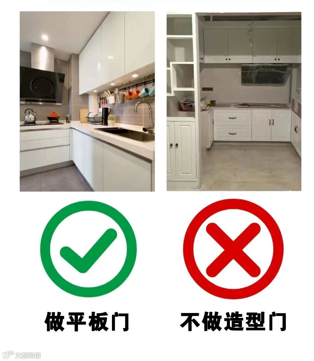 柜门一定不能做造型门,因为厨房的油烟会落在每一条造型上和擦不到的缝隙里,大大增加了做卫生的难度。