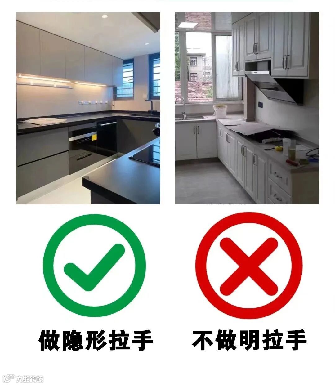 明拉手磕磕碰碰,卫生死角更多。用隐形拉手后橱柜更简洁,适合简约大气的装修风格,视觉效果也更好。
