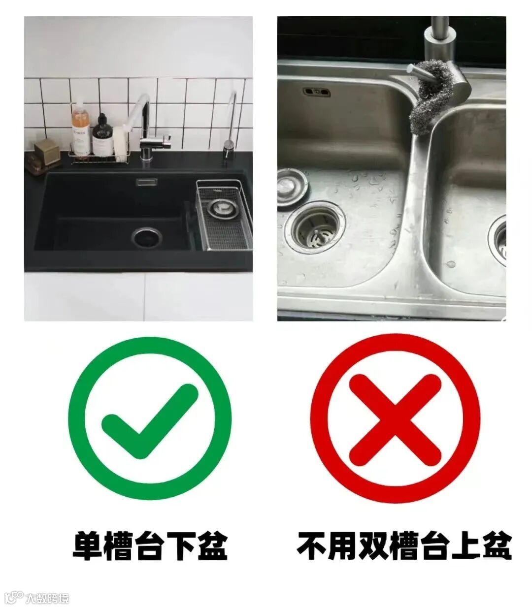 单槽盆比双槽盆的使用率更大;台下盆比台上盆更方便打扫。
