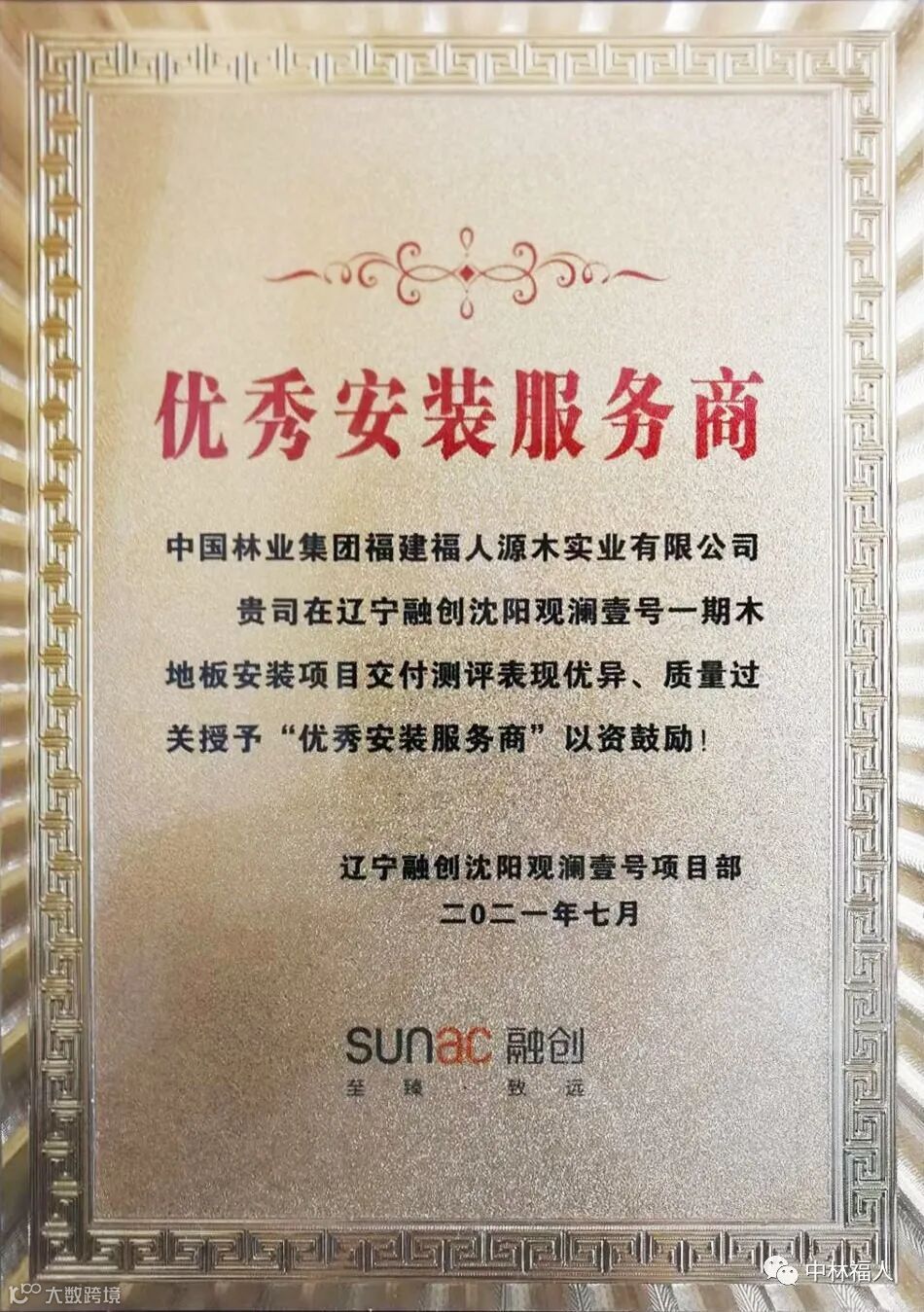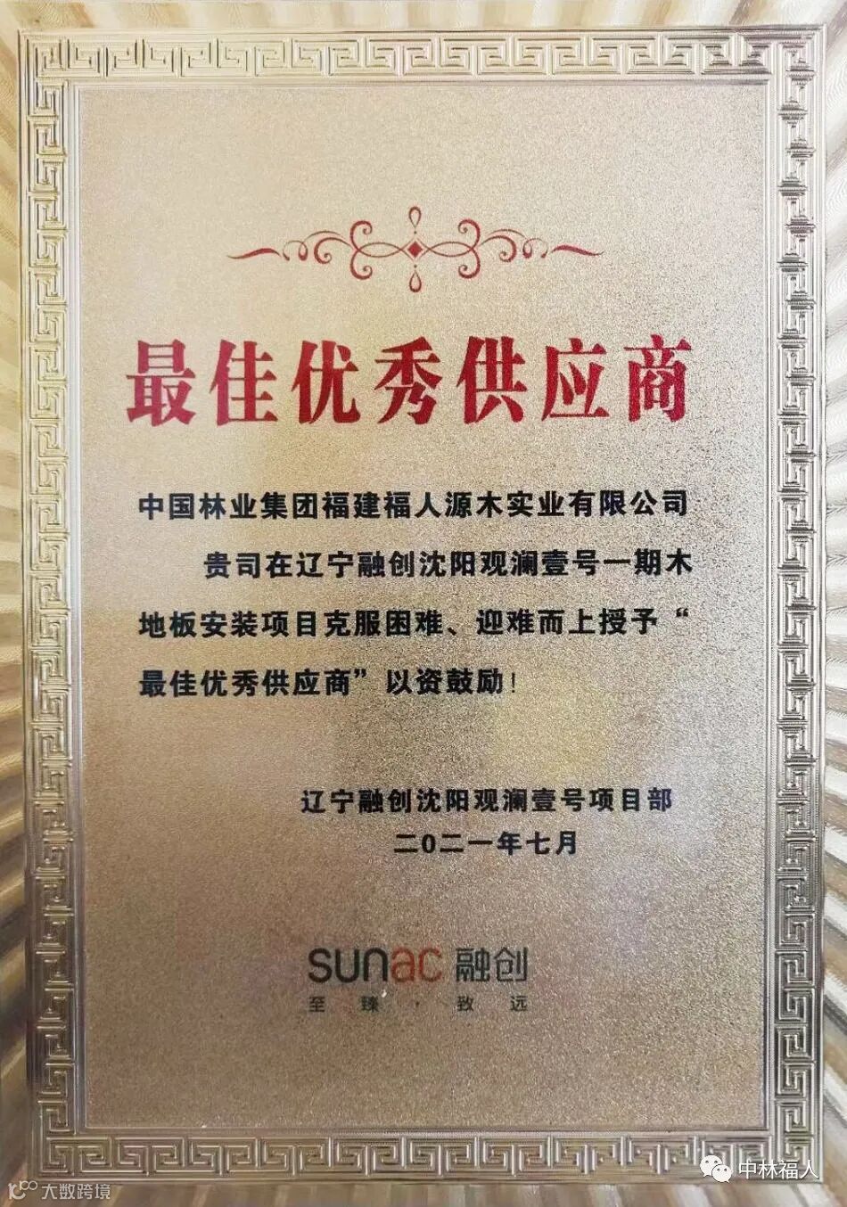 7月,中国林业集团福建福人源木实业有限公司(以下简称中林福人)荣获辽宁融创沈阳观澜壹号项目部“最佳优秀供应商”、“优秀安装服务商”。这是继5月中林福人获得融创地产2020年度优秀地板供应商后,融创单项目部对我们工程服务的又一肯定。