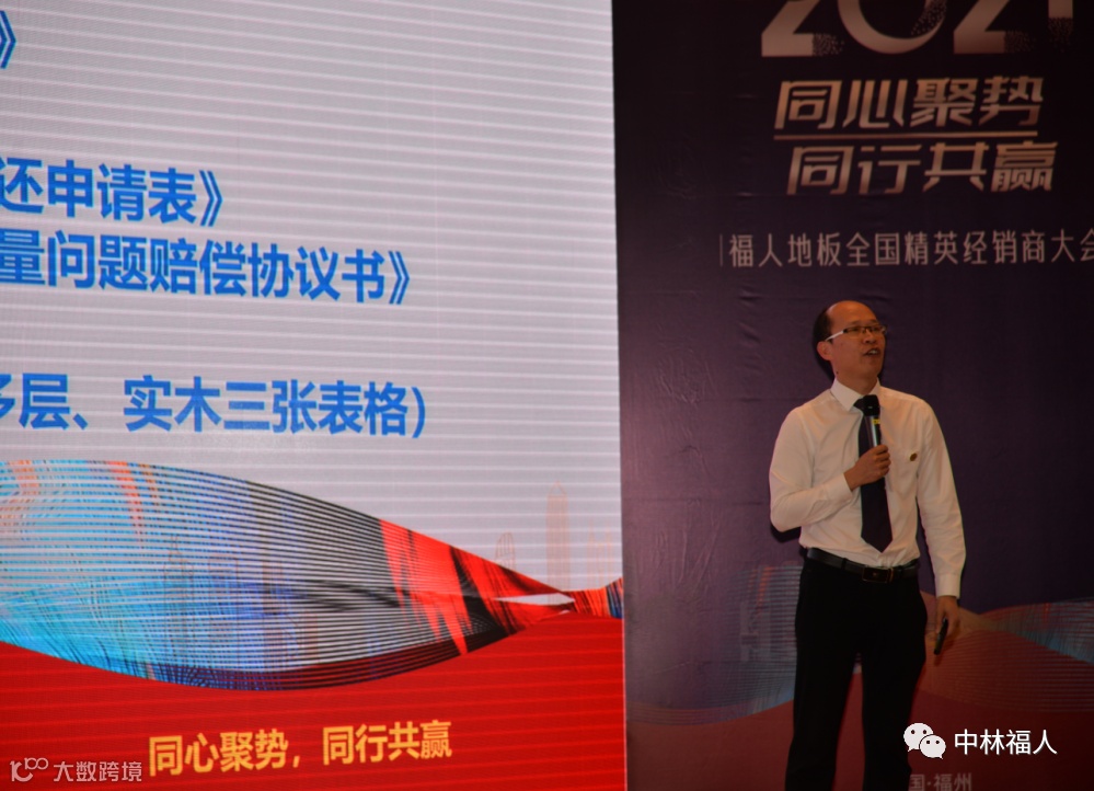 首先,福人地板营销总监石开洪先生做开场演讲。石总在演讲中总结了上一年度销售工作的情况,并对2021年度做了规划和展望。我们将继续坚持“以消费者为中心”,“做服务第一品牌”,为经销商提供更多的支持,和全国经销商朋友们一起互惠互利,携手共赢,共同发展。