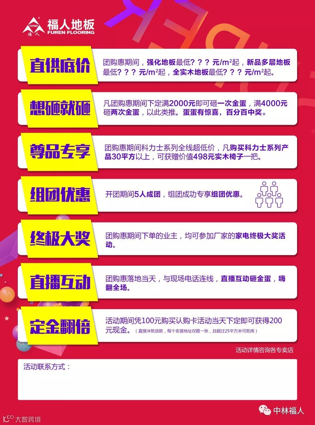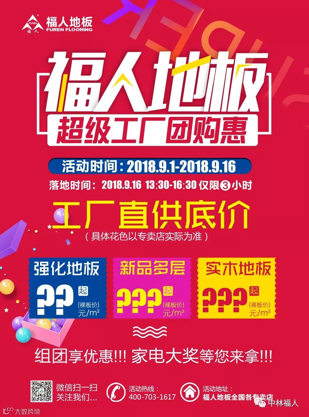 团购惠期间,强化地板最低???元/㎡起,新品多层地板最低???元/㎡起,全实木地板最低???元/㎡起。