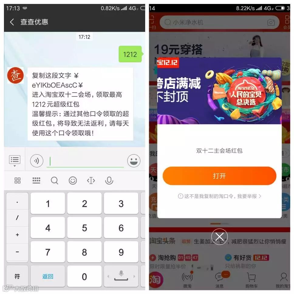 ①发送”1212“给公众号,获取超级红包入口淘口令