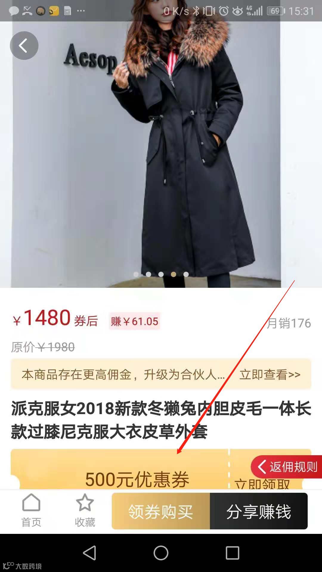 领券后,下单付款时居然立减500元,付款后,还收到了61.05元的购物奖金。