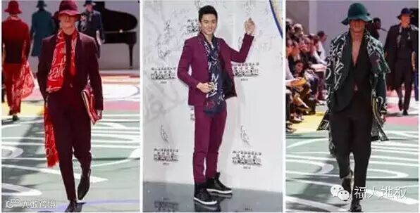 在红地毯走秀环节,宁泽涛身穿的是Burberry Prorsum 2015春夏男装。他身穿一身紫色休闲西装搭配黑色铆钉运动鞋亮相红毯,胸前绑着的印花长围巾画龙点睛,文艺气质十足。