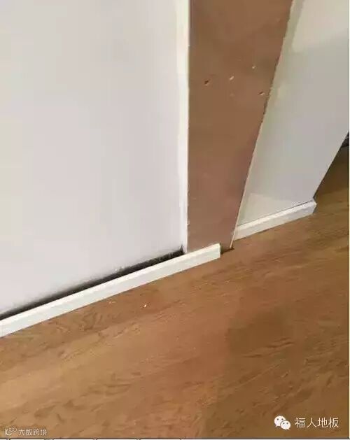 待所有的地板铺装紧密后,取走墙壁周边插入地板的木榫,安装上贴脚线,把地板与墙壁间的缝隙遮盖掉;地板与