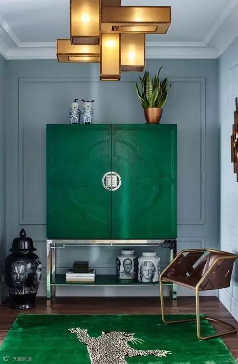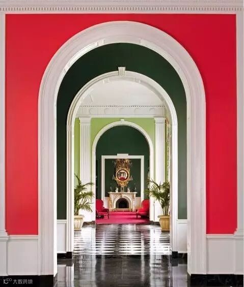 这是一个很出彩配色方案,色彩与空间真正舞动起来,它们各自独立却心在一起。开笔就在前门运用鲜艳红色,激起人们的热情,同时将这一红色延展至后方客厅的家具和地毯,首尾呼应,为红色创建了最后的视觉落脚点。再看绿色的运用:过道门框所用的墨绿色一直延展至后方客厅的壁炉背景墙,两者之间还填充了一抹青翠的浅绿色!于是整个空间有了两个相同的红色模块,又有两个深浅度不同的绿色模块,让人的视线游走于鲜丽色彩世界中却丝毫不觉得忙乱,特别要注意设计师对白色的充分运用(门拱、护墙板、廊柱、装饰线等),它为红与绿的争芳竞艳注入冷静与轻盈,从而创建了色彩平衡。