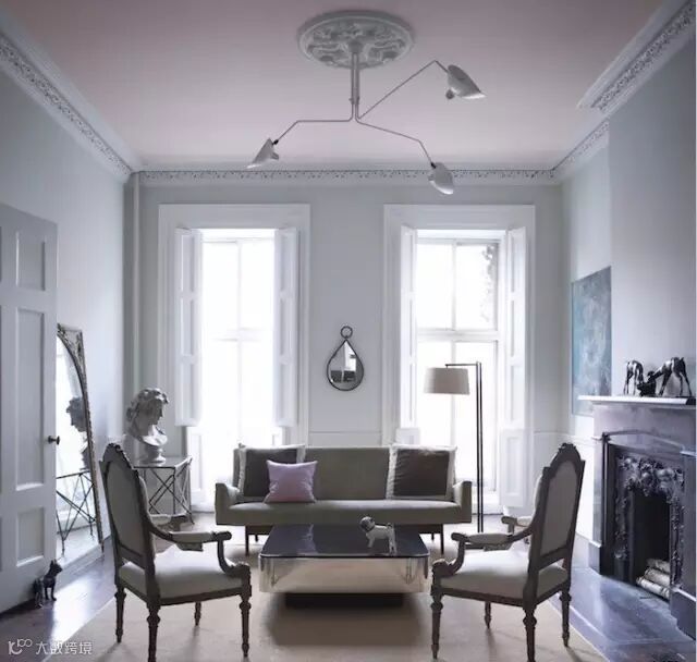 引色不能不谈焦点创建。焦点创建通有两个前提:一是特别想让人注意你有什么;二是特别不想让人注意你有什么。前者的目的是表现,后者的目的是掩饰。上图案例的粉红色天花不仅为空间增加浪漫的女性化气质,同时使屋顶的雕花线条突显出来,相当于运用一面空中背景墙展现主人的精致品味。值得一提的是:在现代的用色理论中,人们早已不再局限于天花一定要刷白,实际上设计师视天花为第五面墙,想方设法用天花为设计添香增色。