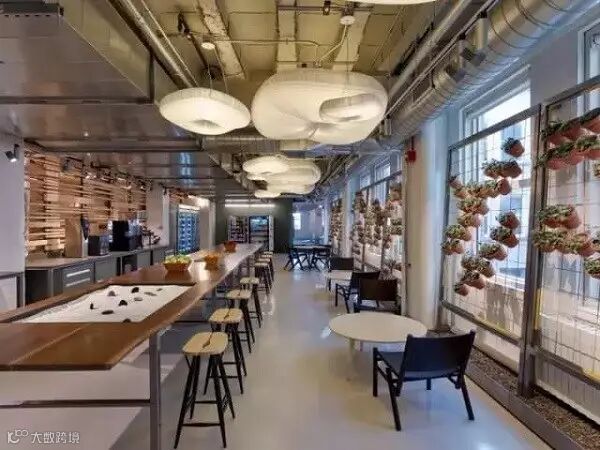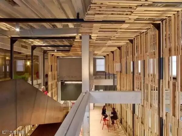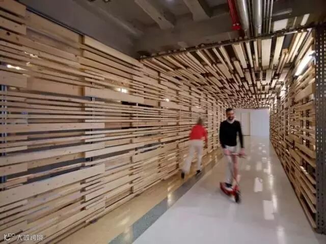 研发中心的室内标高高达10米,为了将顶层和屋顶连接起来打造一个集体活动区,在这里特意设计了一个“大阶梯”作为员工的集会场所,“大阶梯”和屋顶区域用于举办娱乐活动和组织集体活动,这里采用天然材料和木制结构,模仿美国中西部具有地区特色和透明审美风格的仓棚建筑。