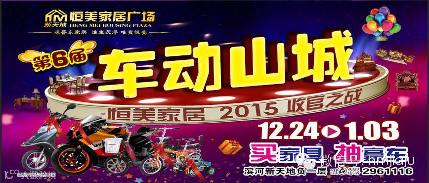 恒美家居第六届“车动山城,耀世登场”。12月24日—1月3日,百家品牌,万款特价,年末大冲量,加油卡、微波炉、水星套被、洗衣机、挂烫机、如意拖、台灯等大奖买就送,消费满2000元的顾客,还能抽豪车大奖,再有平衡车、本田摩托、真爱电动车、山地自行车等您赢。