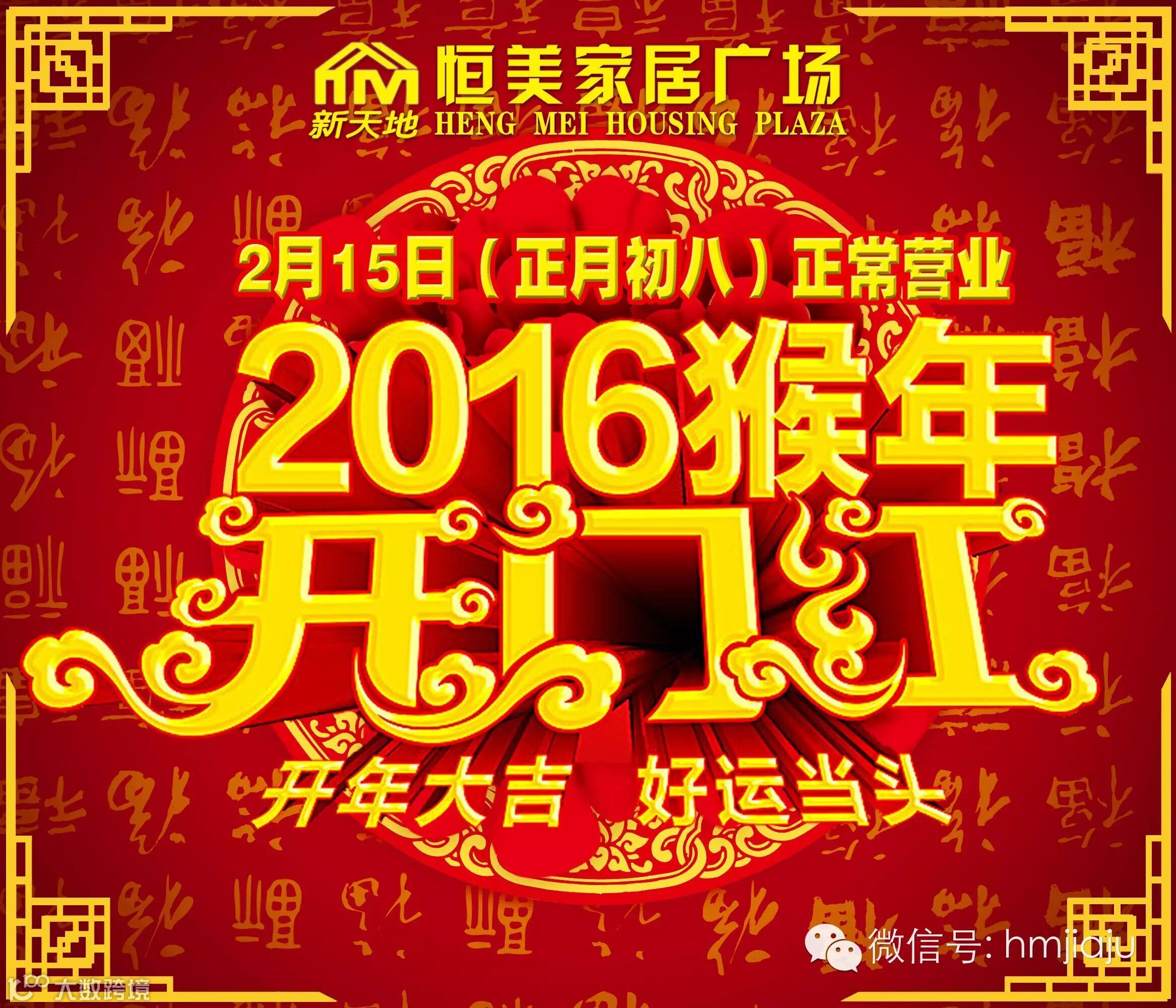 我们将于今日起正常营业,欢迎您的光临!恒美家居广场再次恭祝您:新春快乐;猴年大吉;阖家欢乐。