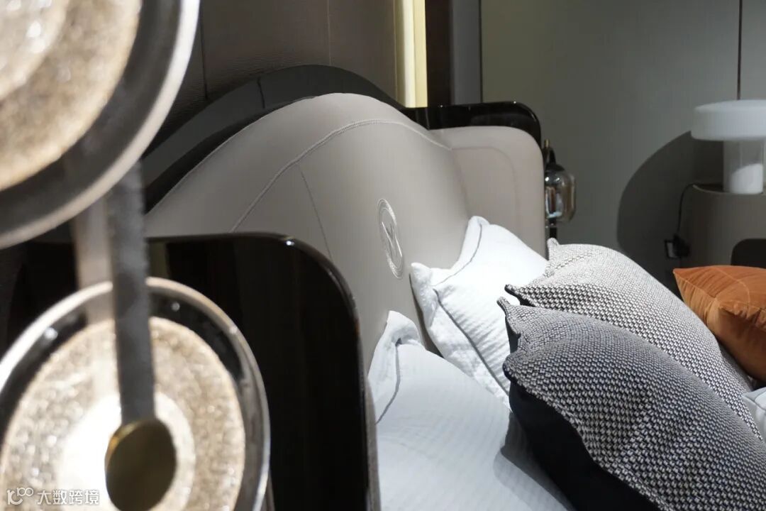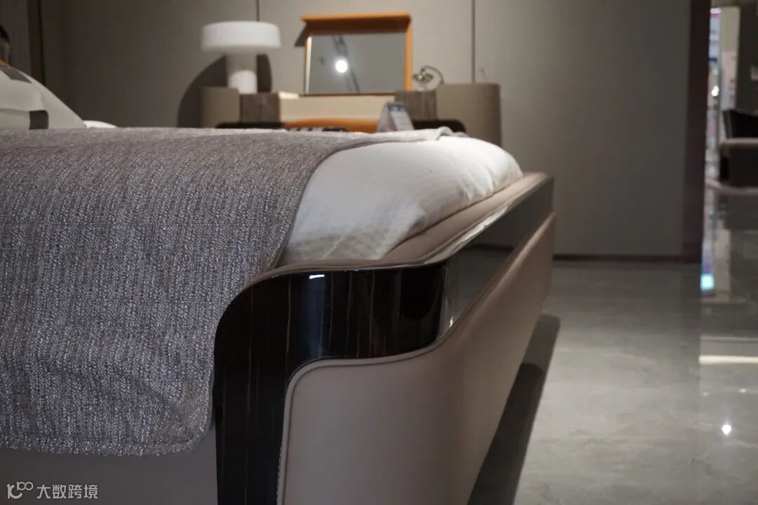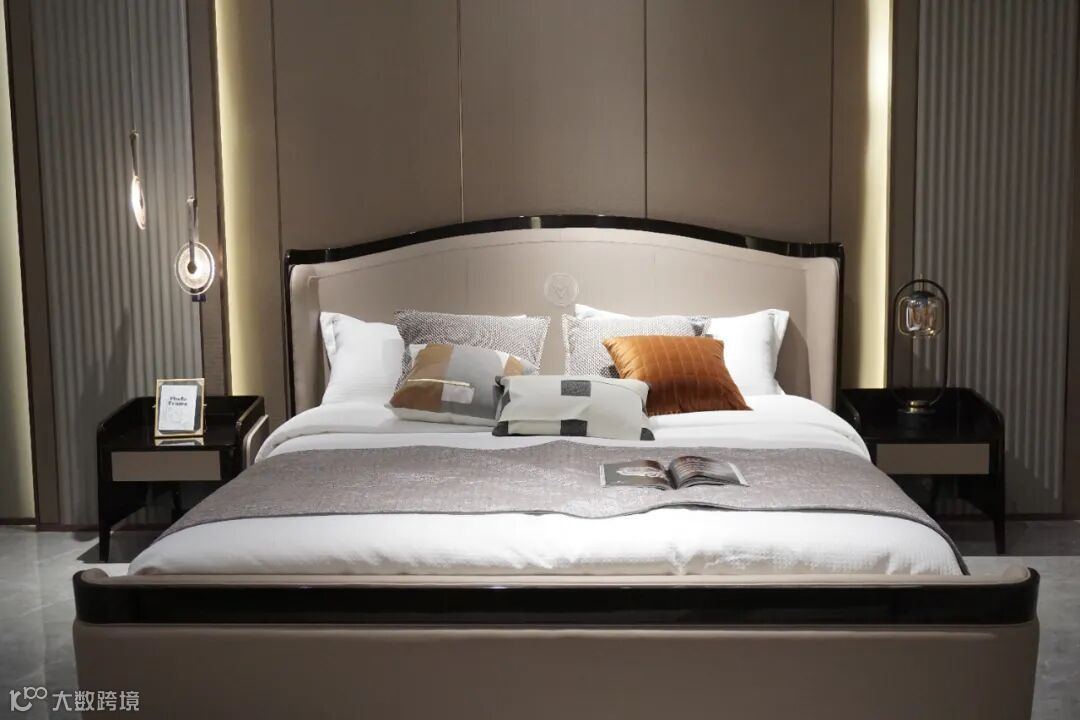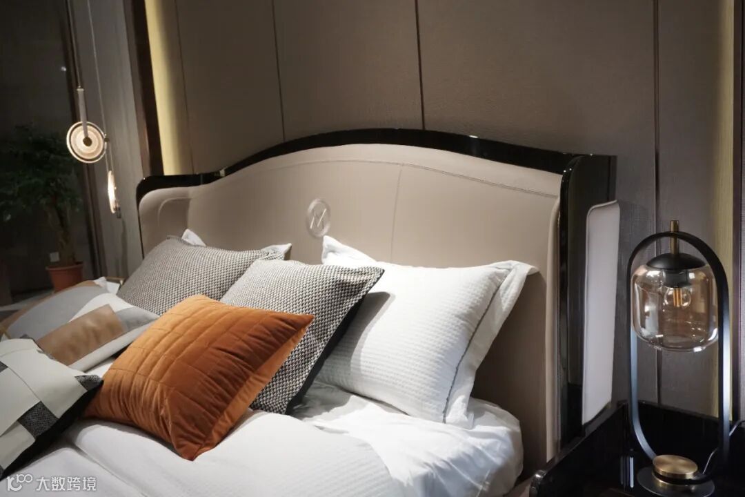 床头柜和床架都用黑檀木饰面作为点缀,延伸出淡淡的传统轻奢感。