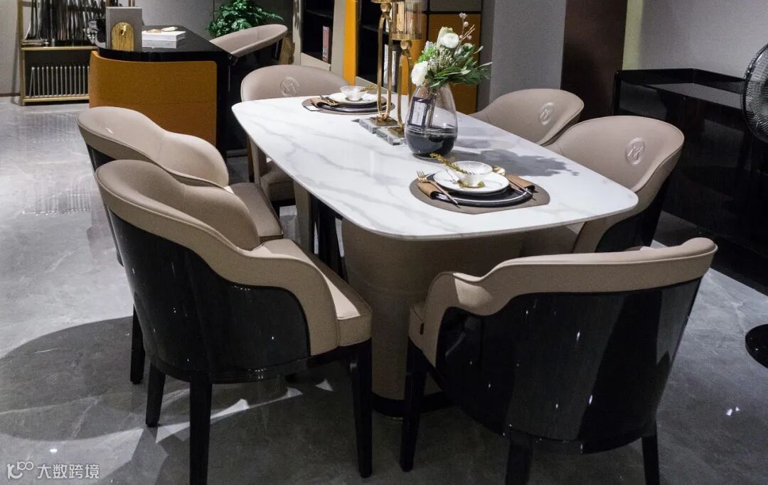 餐厅与客厅相连,所以在色彩上延续了主题,进口纳帕皮质餐椅搭配鱼肚白奢石餐桌,使氛围更加摩登,充满精致感,呈现出复古美与现代美两种迷人风采。