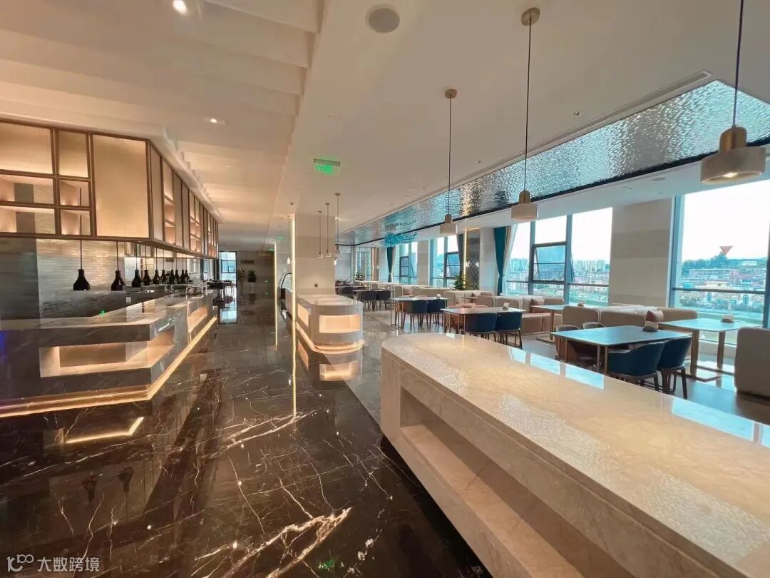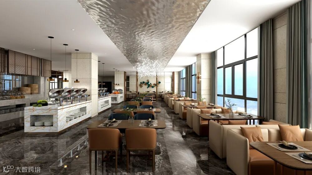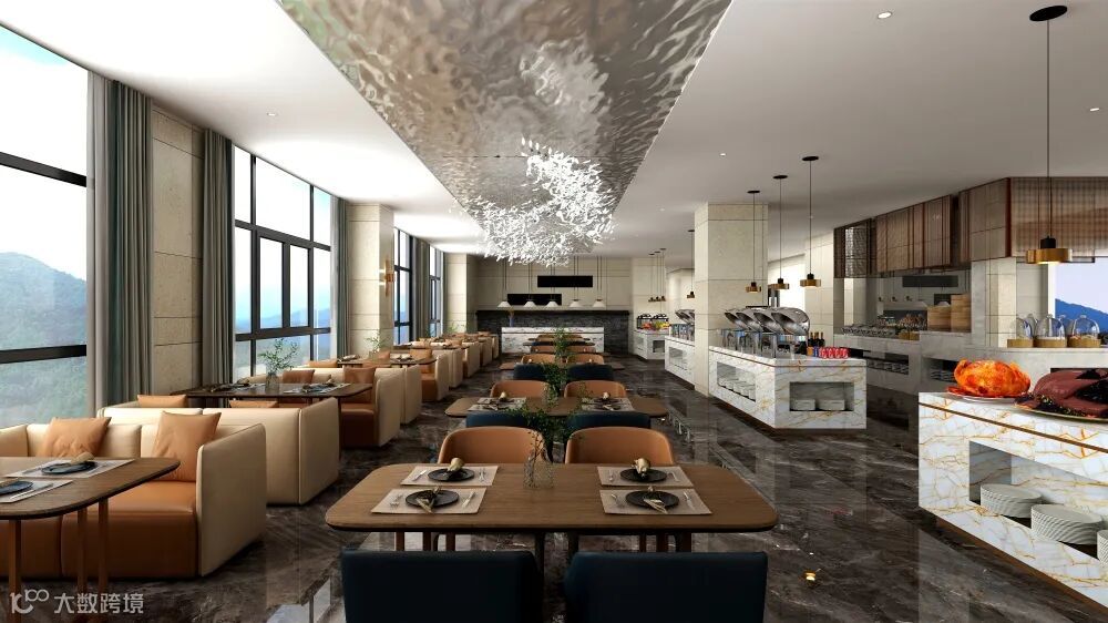 开放式布局打破了传统酒店封闭的空间格局。皮质餐椅、金属餐桌脚架不仅完美地体现出了餐厅的奢华,更给用餐环境带来了温情与浪漫。