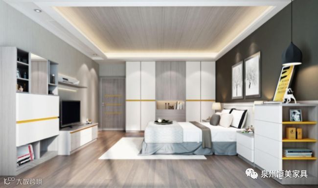 直纹橡木+亮光UV门板;门板采用斜切封边工艺,无拉手回弹设计,时尚潮流