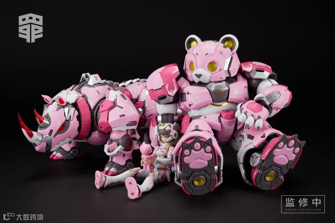 犀牛「椰子撞撞」多处搭载可动机关,展开即可外露武装与细节;背部的磁轨炮亦具有展开机关,还原击发造型;同时,犀牛「椰子撞撞」的武装亦能给巨熊「憨尼抱抱」搭载使用。