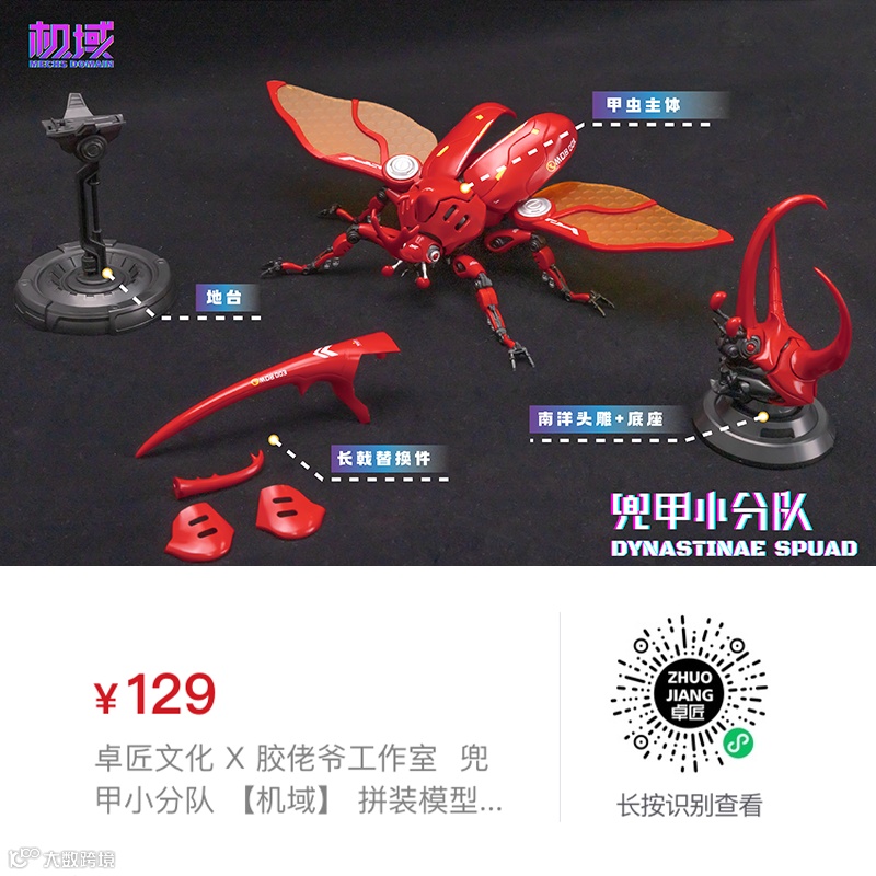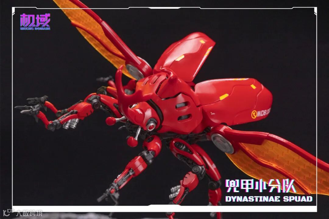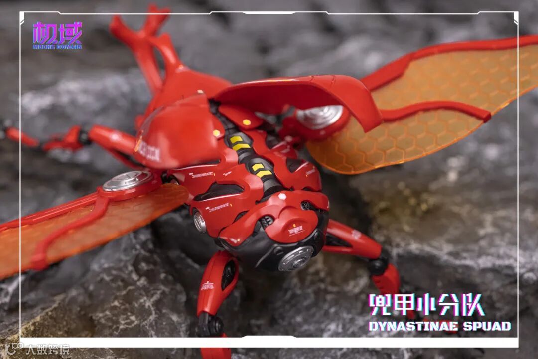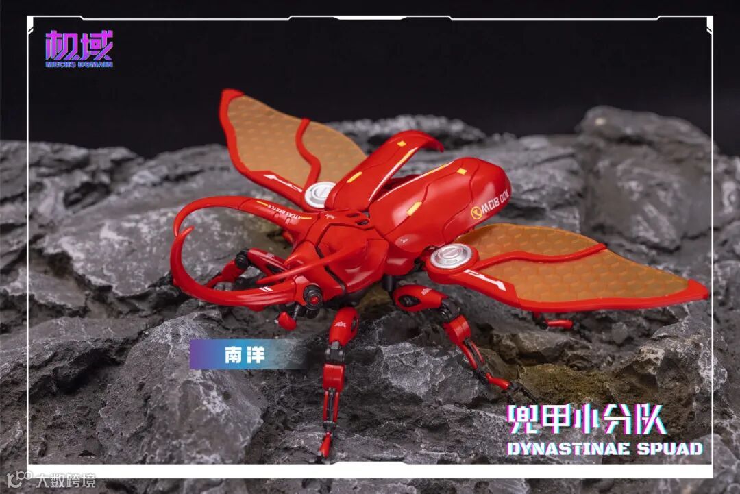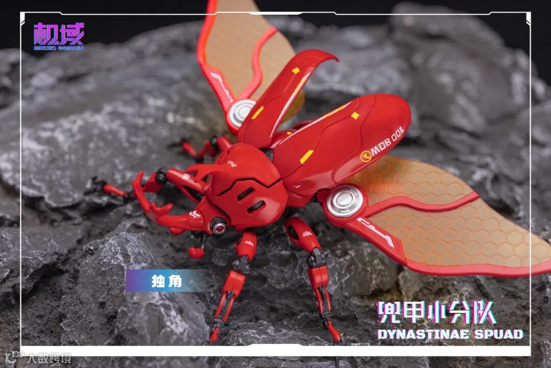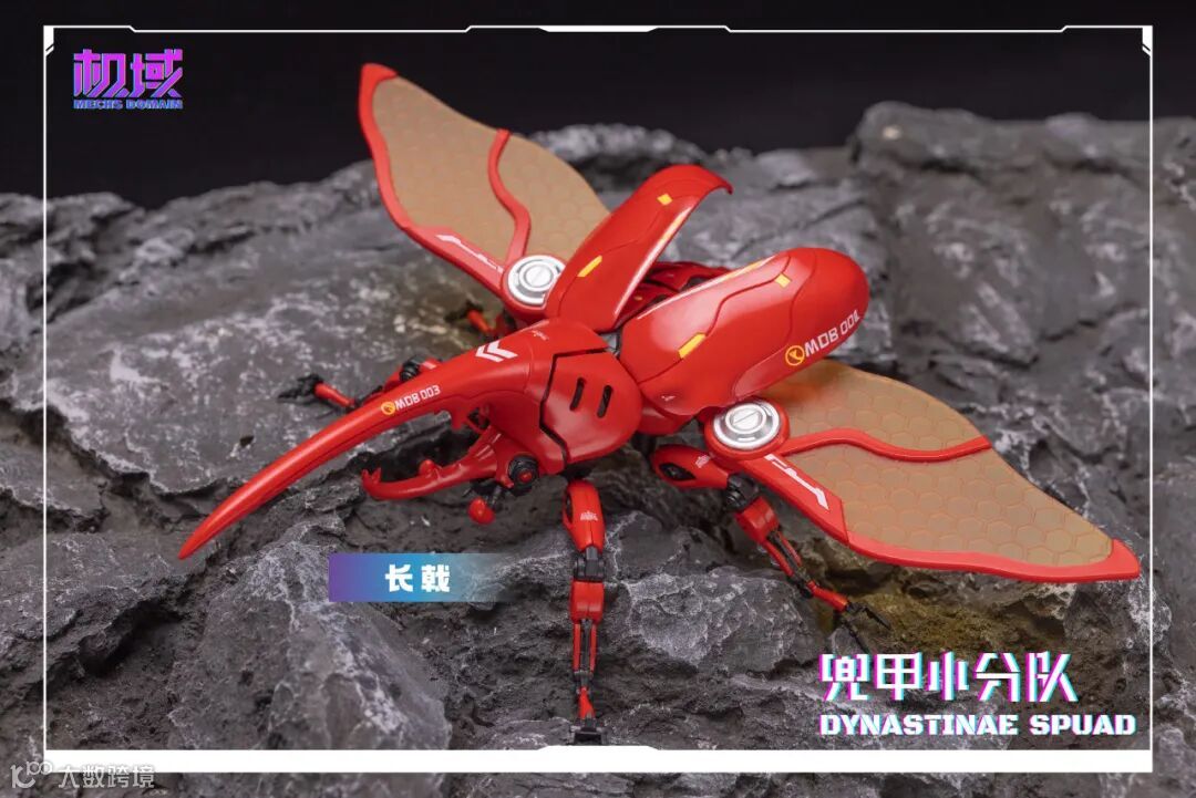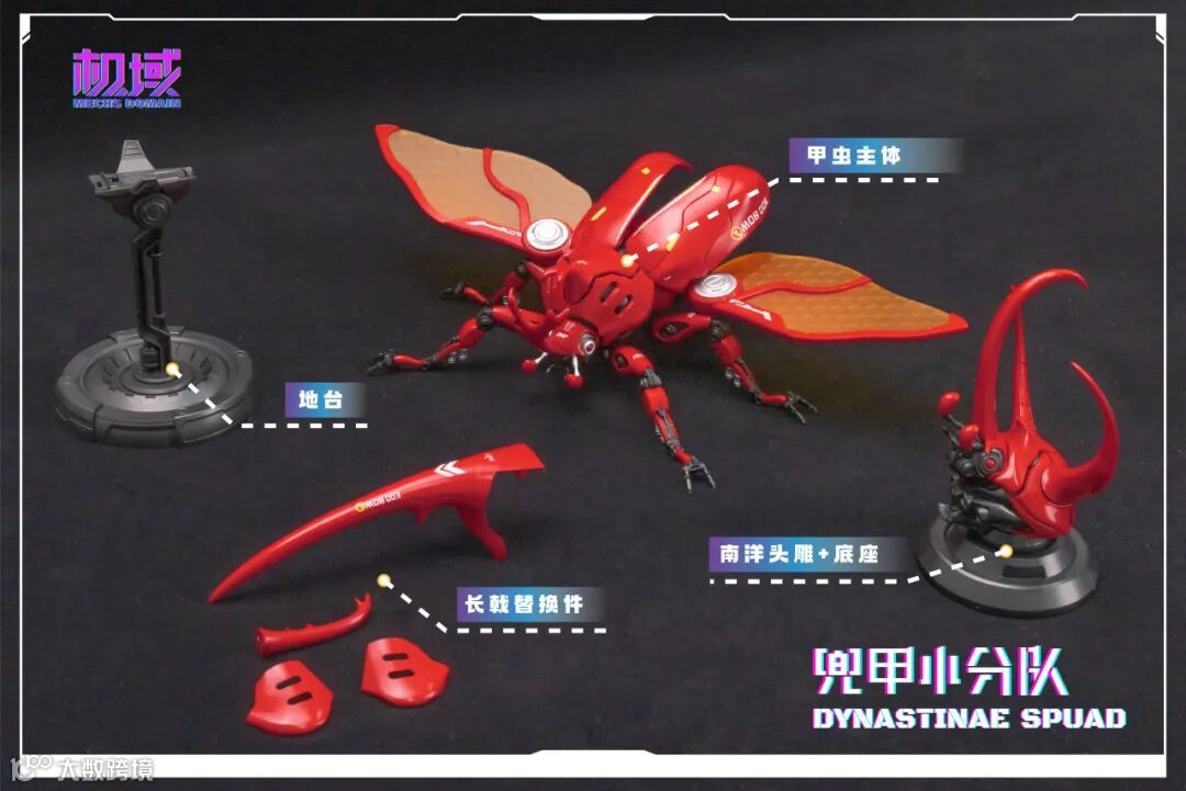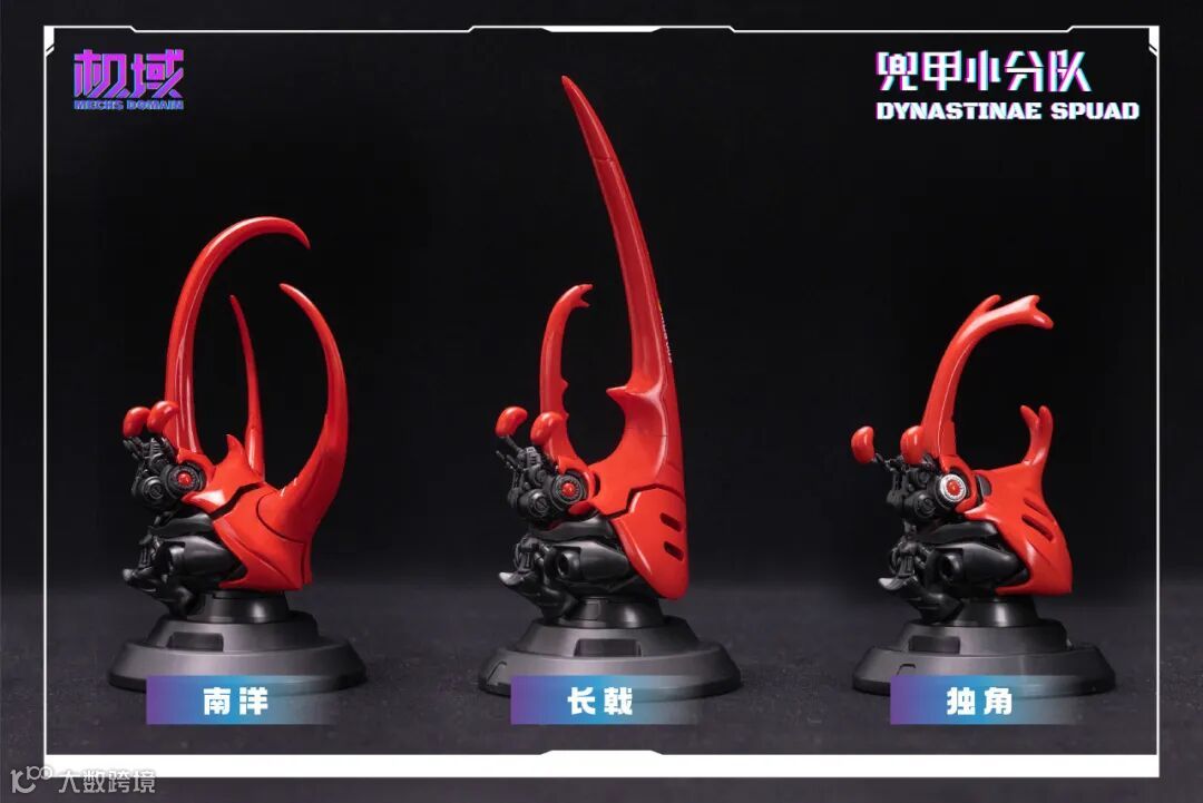 通过替换零件可得到「独角」、 「南洋」、 「长戟」三种形态的完整体及头雕,使兜甲小分队更具可玩性及观赏性。头、胸、腹、翅、腿多处可动,并配备完整体支架及头雕底座,以达到不同形态展示效果。