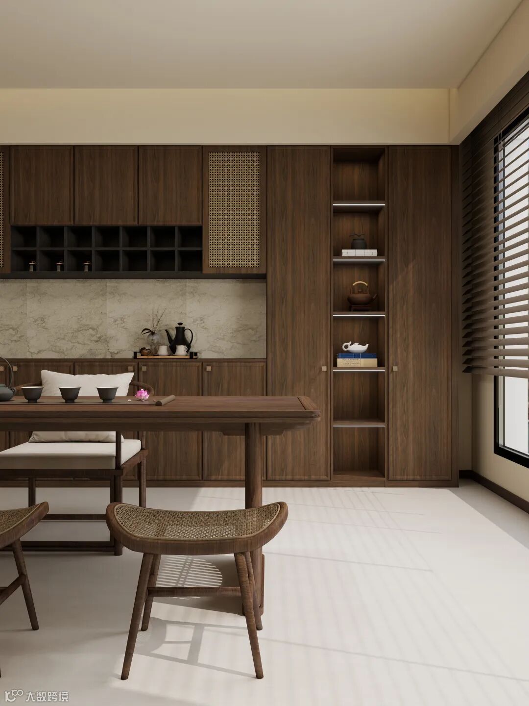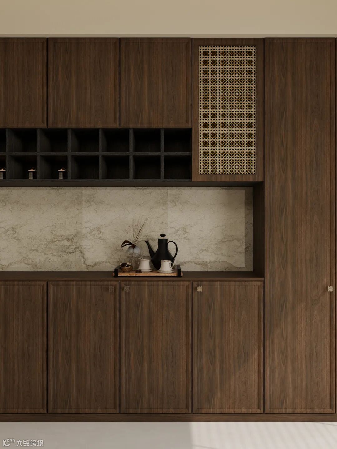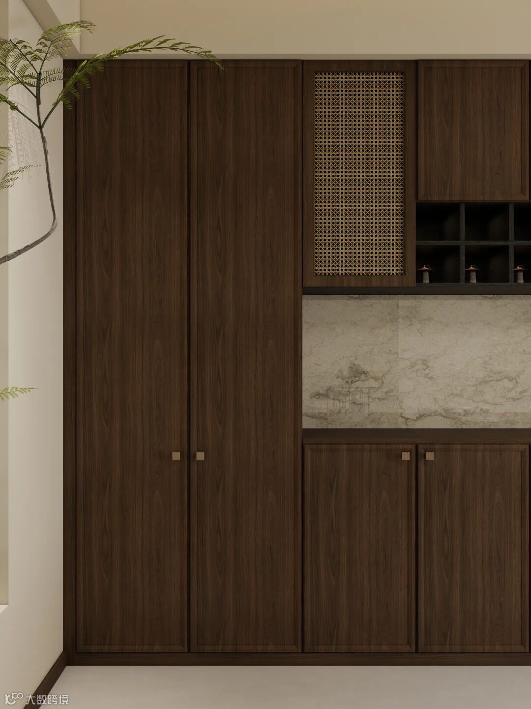 深木色是空间的骨,如半山暮色里浸了月光的木石,不抢目,却自带着岁月的沉。柜门是连绵的山影,几处镂空的格栅偏生织就了江南的雾 。