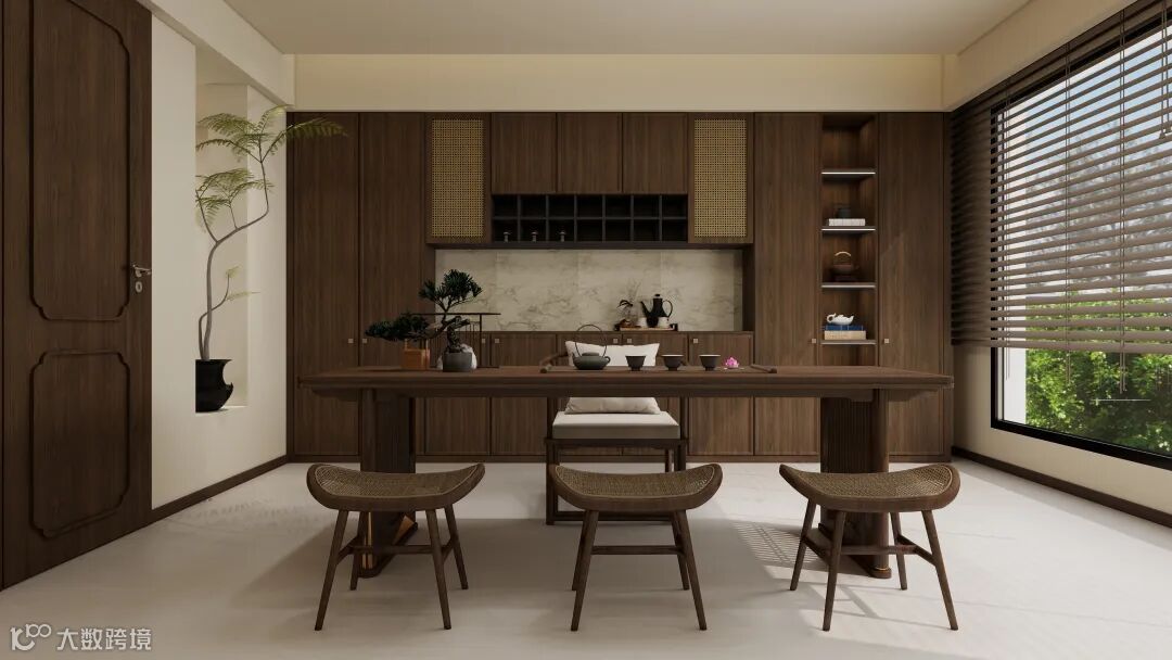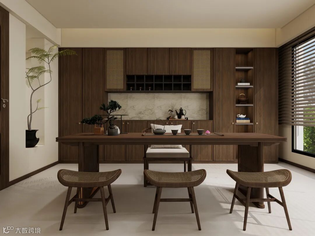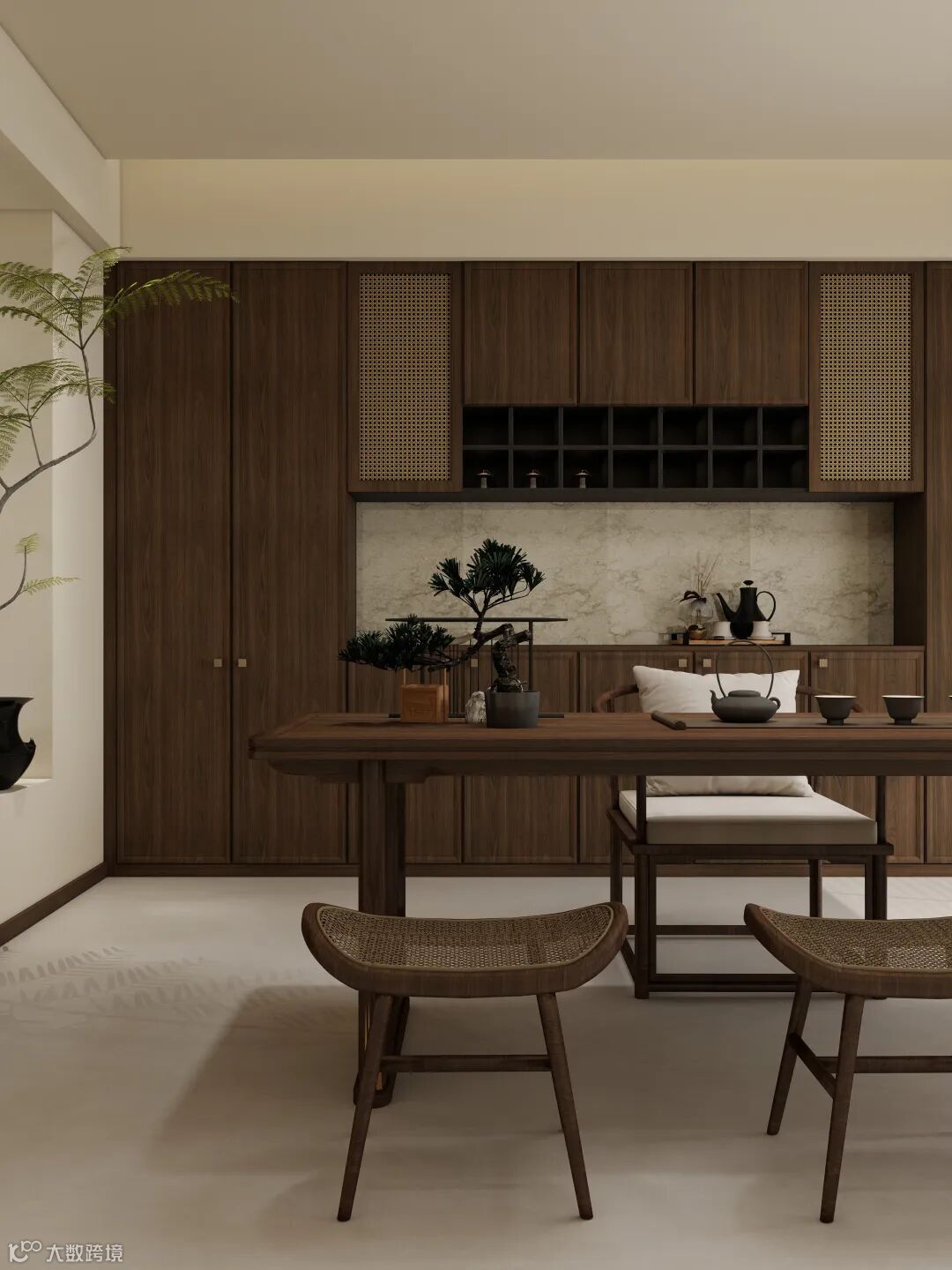 深木色是空间的骨,如半山暮色里浸了月光的木石,不抢目,却自带着岁月的沉。柜门是连绵的山影,几处镂空的格栅偏生织就了江南的雾 。