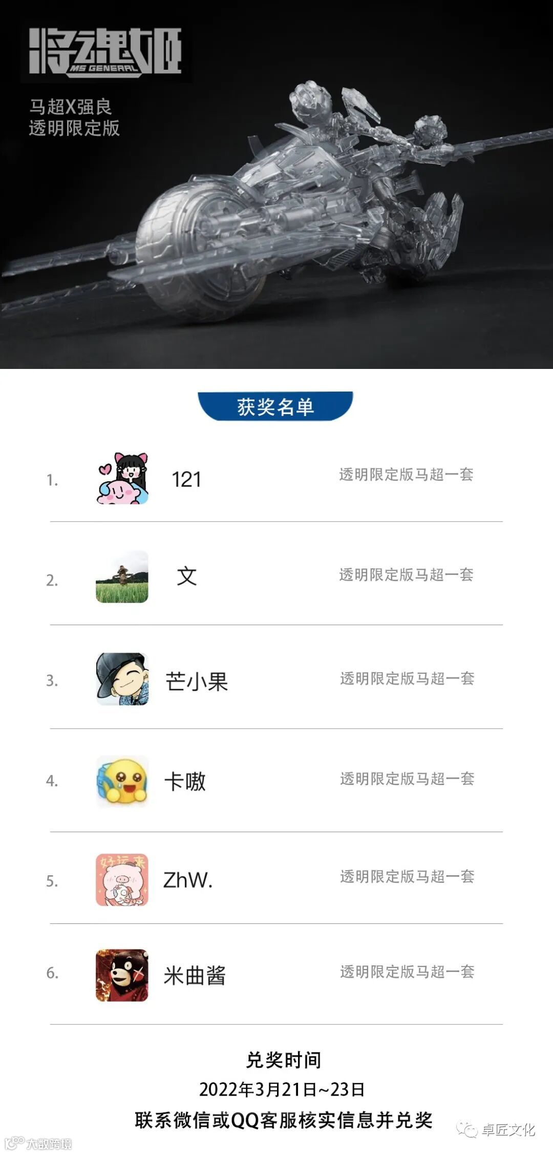恭喜以下6位粉丝朋友获得【马超X强良】限定透明版一套,微信公众号官方统计工具@订阅号助手 对本次转发分享活动进行统计,结果公正有效!请中奖的粉丝于3月21日-3月23日私信微信或QQ客服核实信息并兑奖,过期视为自动放弃!