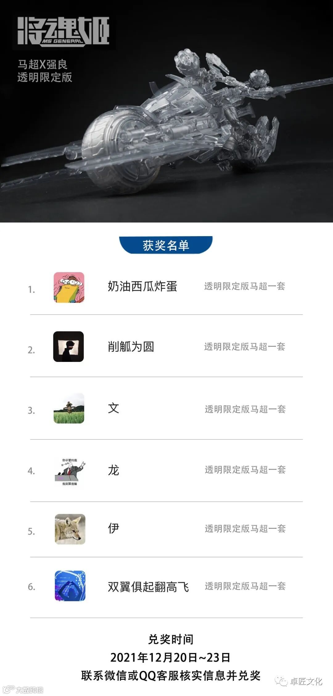 恭喜以下6位粉丝朋友获得【马超X强良】限定透明版一套,微信公众号官方统计工具@订阅号助手 对本次转发分享活动进行统计,结果公正有效!请中奖的粉丝于12月20日-12月23日私信微信或QQ客服核实信息并兑奖,过期视为自动放弃!