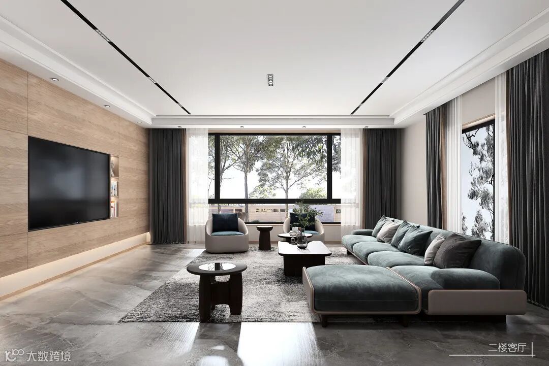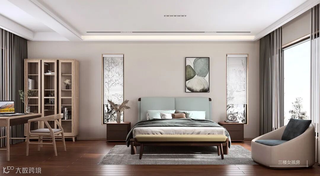 二楼空间由休闲区、主卧、书房等形成家人日常休憩、沟通和交往的区域,既有木作的温润质感,又包含了现代时尚气息,是一个充满自在氛围的自我活动空间。
