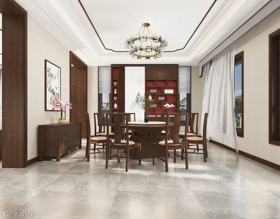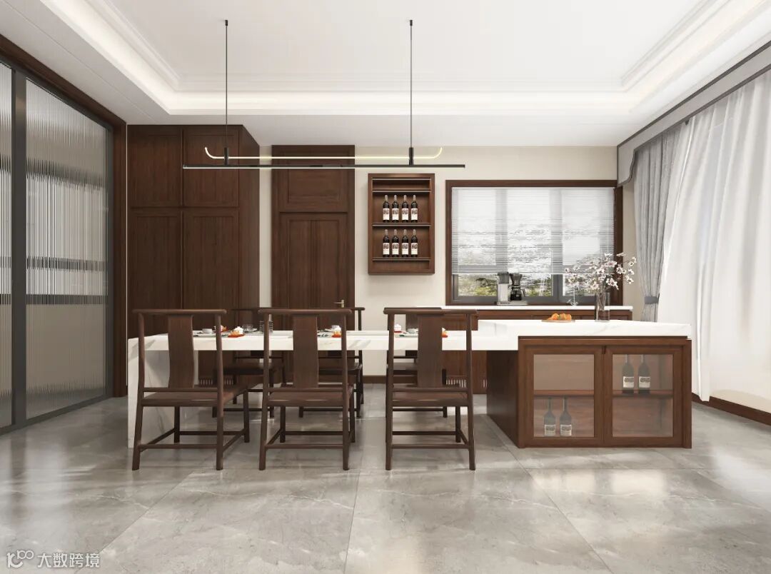 餐厅隔挡由屏风改为实墙,出于对空间聚气以及隐私性的考量,人间烟火气的围聚意味着祥和、圆满。