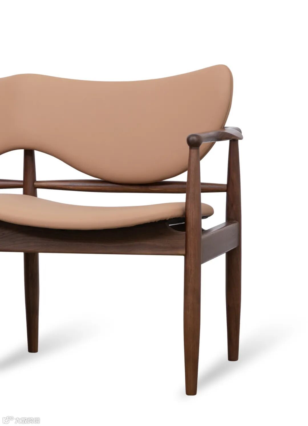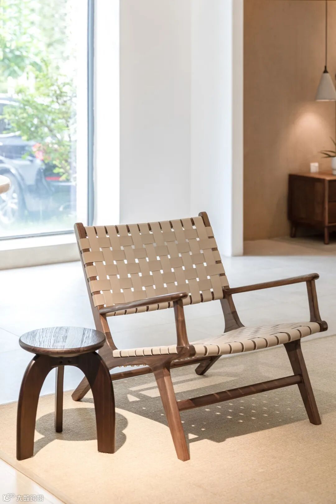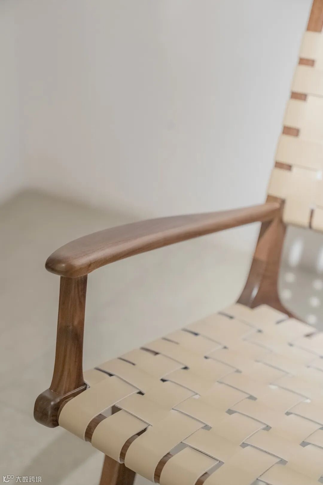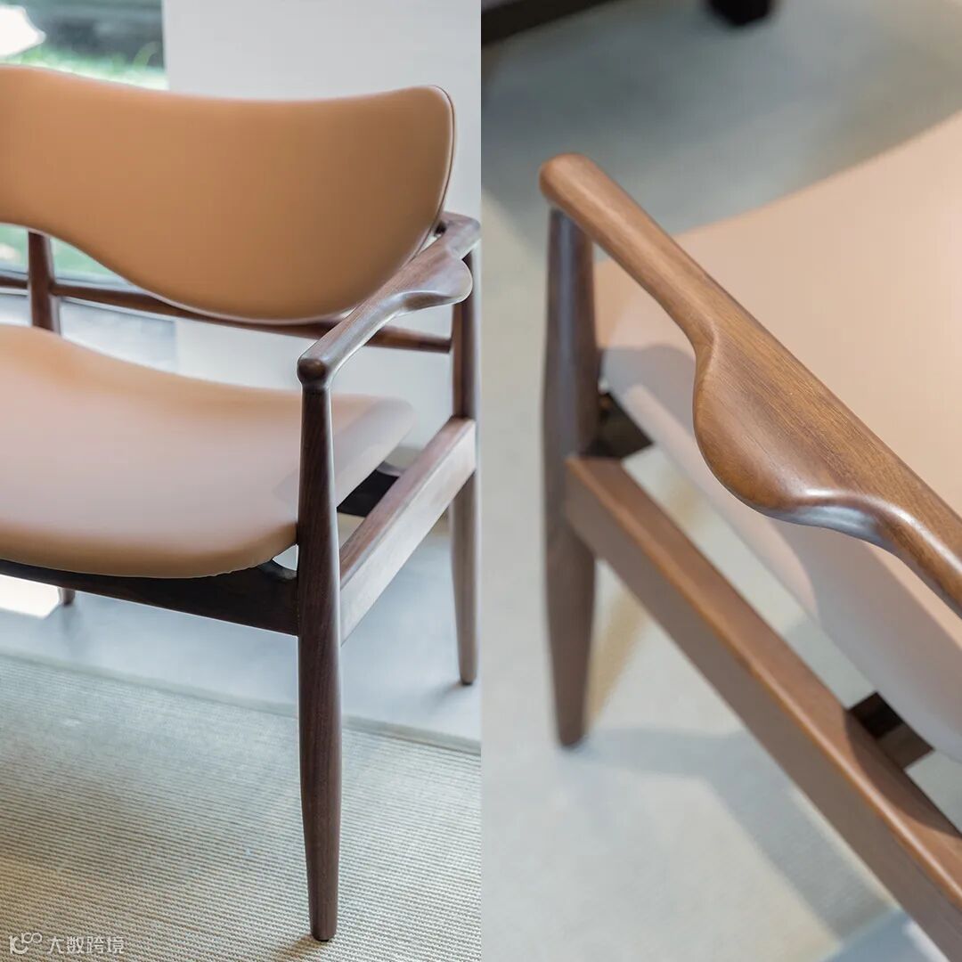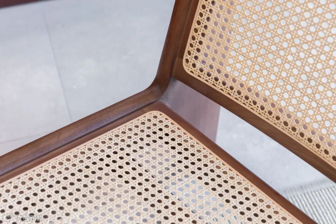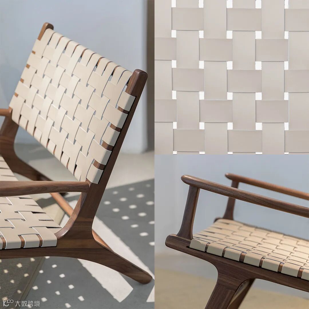 用料上,黑胡桃木搭配马鞍皮,高雅中带着自然和轻盈的感觉,座面采用2mm厚的马鞍革编织,保证了韧性和透气性,结构简单又稳定。