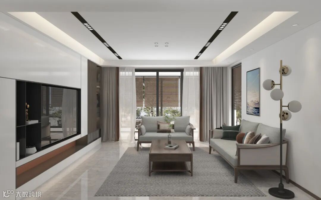 客厅整体采用无主灯设计,线条简洁的现代空间大面积运用暖白色与黑胡桃木,温馨且有格调。软装的布局在不规则的设计中又呈现出规则的舒适度。