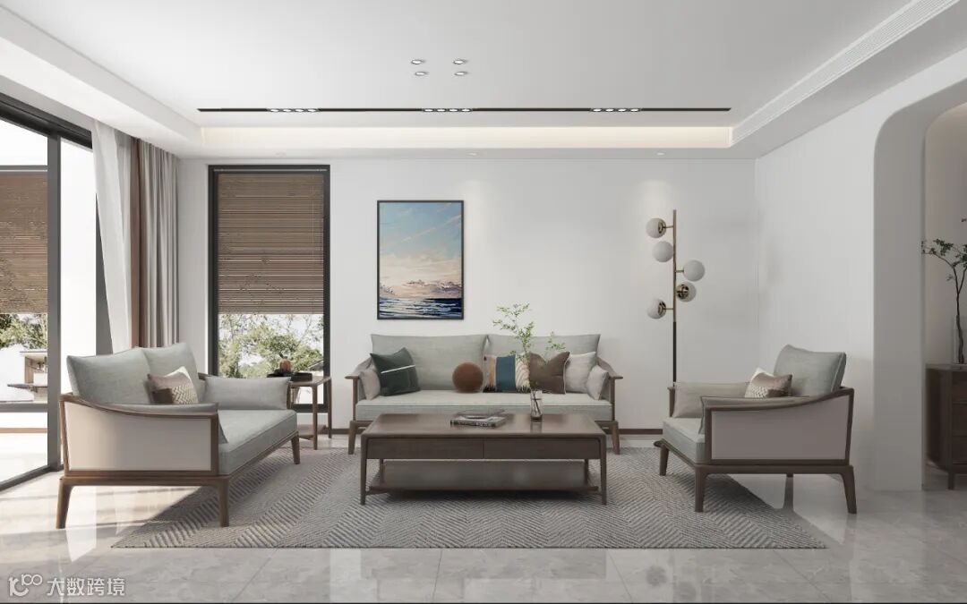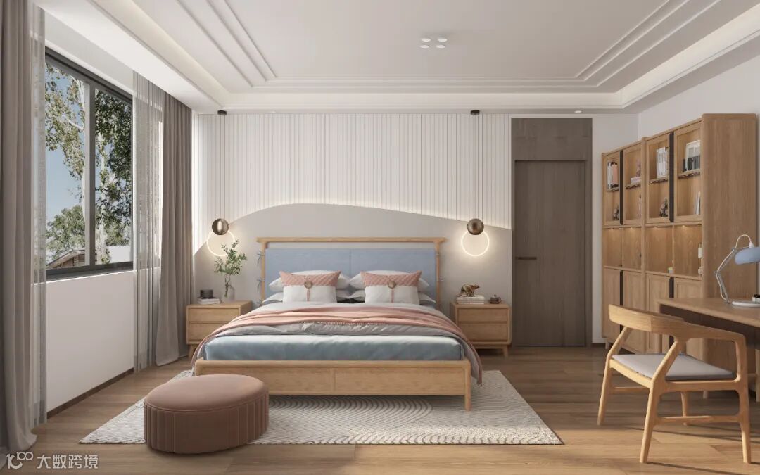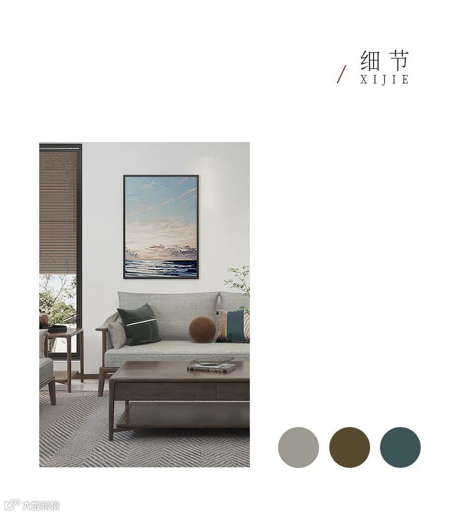 现代东方的意蕴,凝练在朴实无华的细节处,清新淡雅的色彩调和,搭配抽象挂画与禅意造型的绿植,展示出现代东方风格的简洁利落。