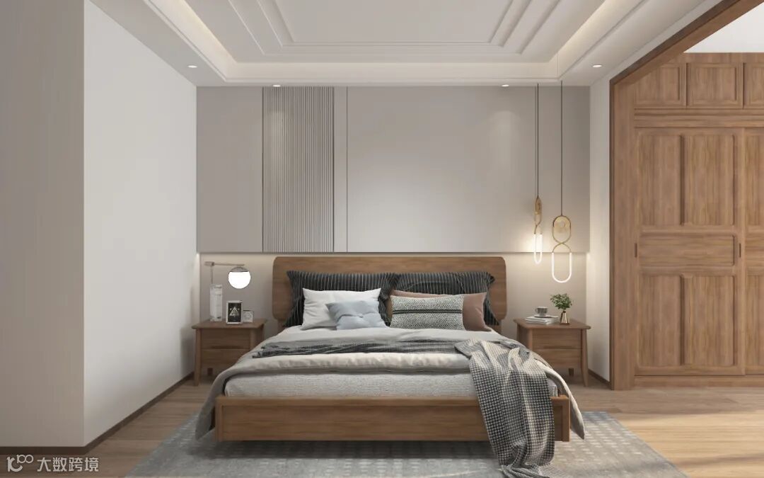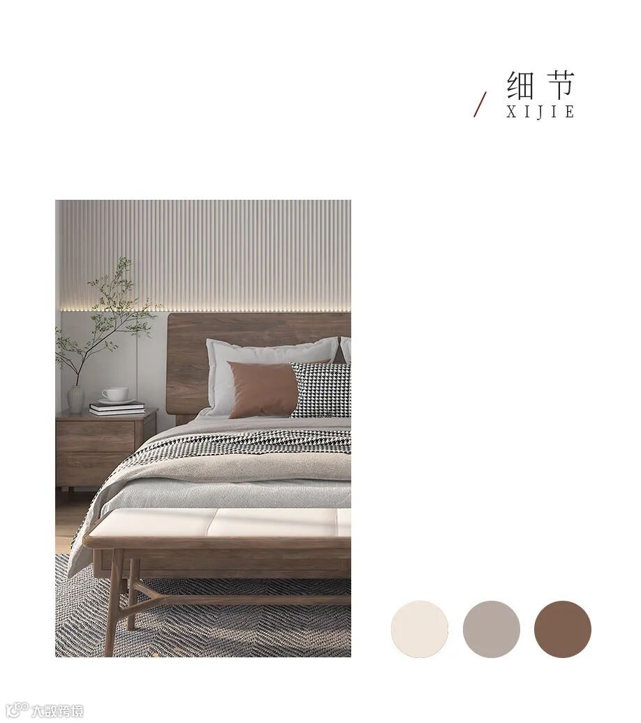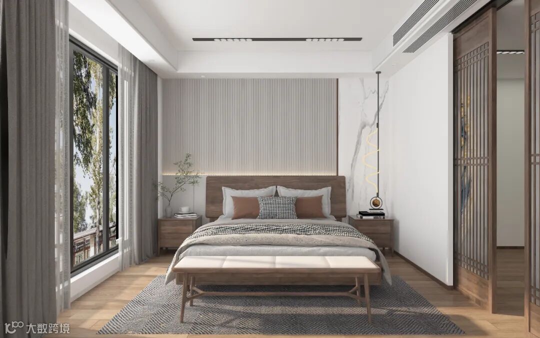 主卧的软装色调以黑胡桃木色为主调,搭配中性色低饱和色彩,为卧室空间带来宁静氛围的居住感。木门与背景墙的木格栅作为点缀,形成直线的流动感。