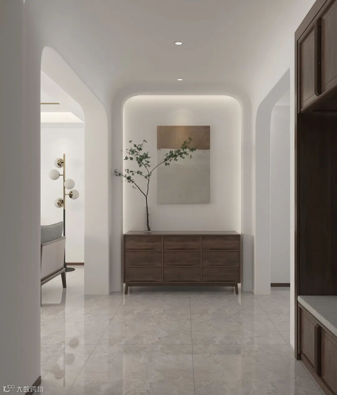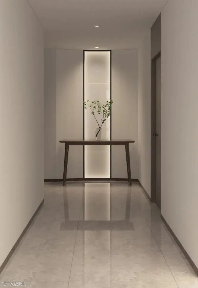 走廊尽头摆放的案几,与玄关的设计如出一辙,在氛围光的烘托下营造中式意境。