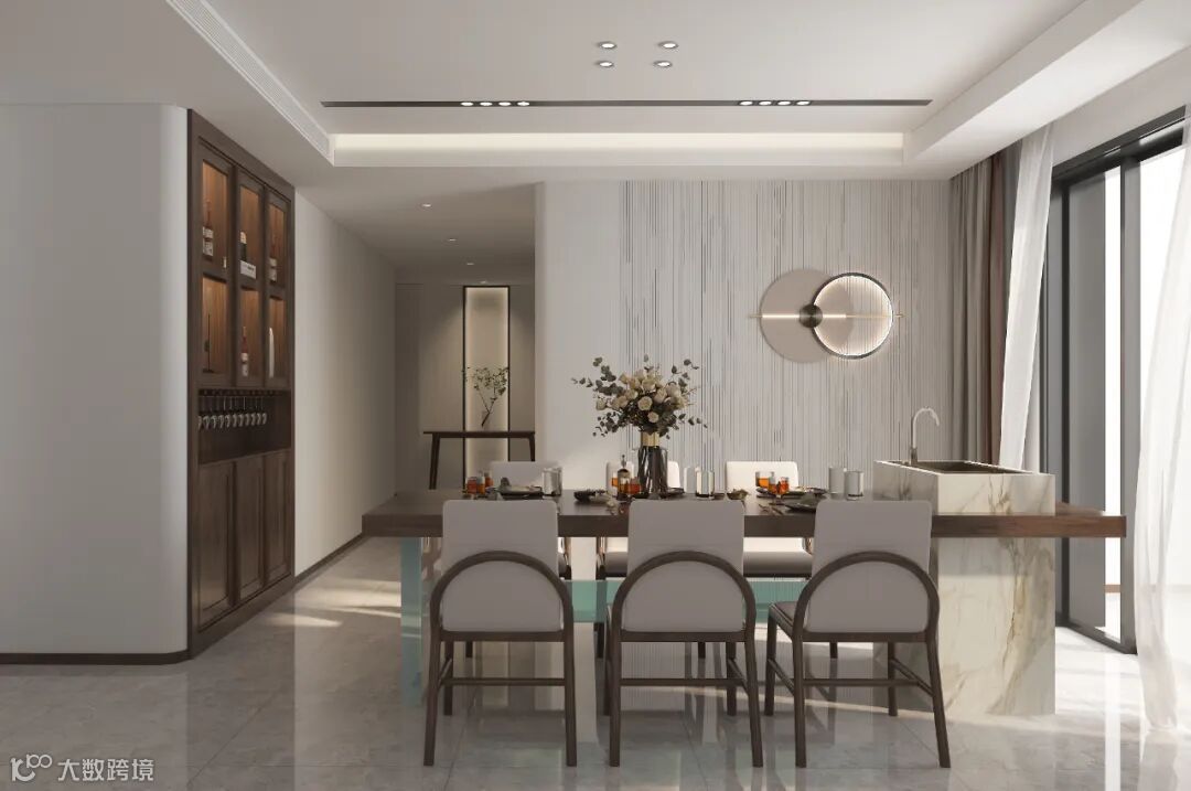 餐厅连接着玄关的另一侧,结合业主的饮食习惯,设计师为其搭配了水吧功能的大板桌,酒柜使用了嵌入式设计与墙面齐平,背景墙的纹理装饰,无处不体现着现代感。嵌入式的