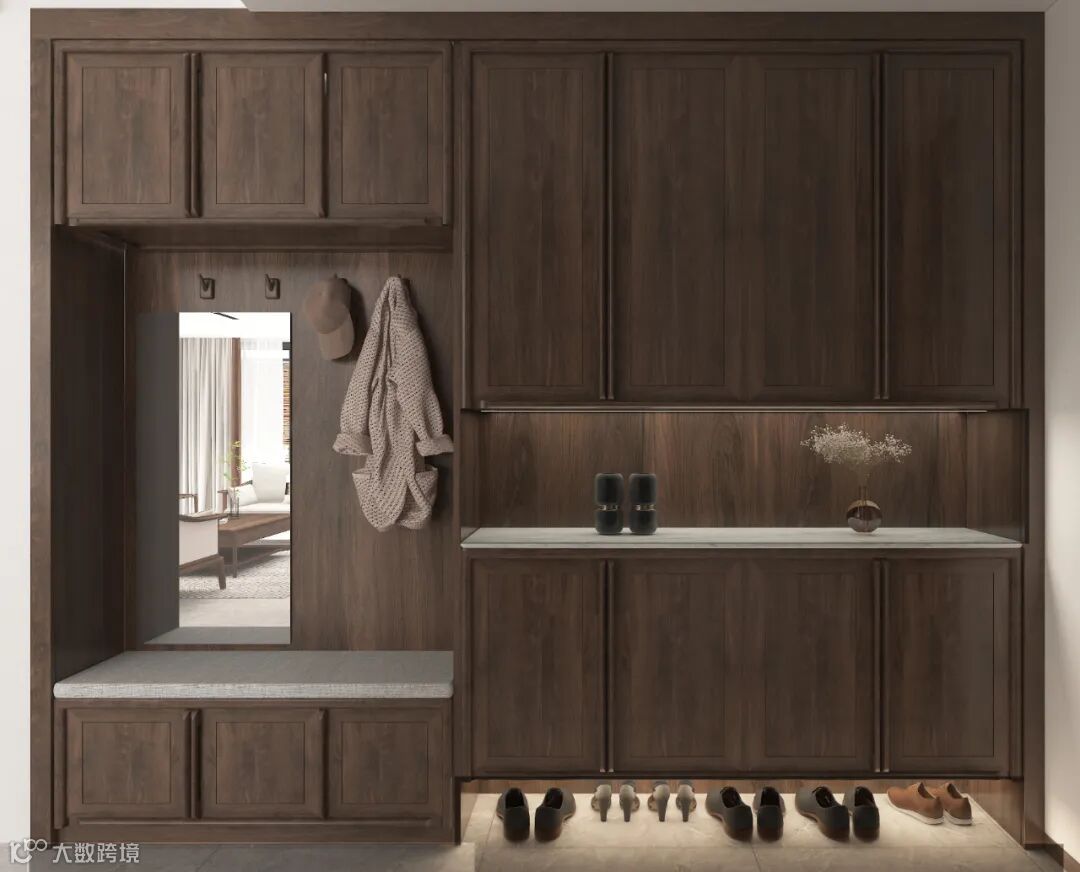 进门右侧,实木定制的鞋帽柜结合了换鞋的需求与收纳空间,空间功能井然有序。