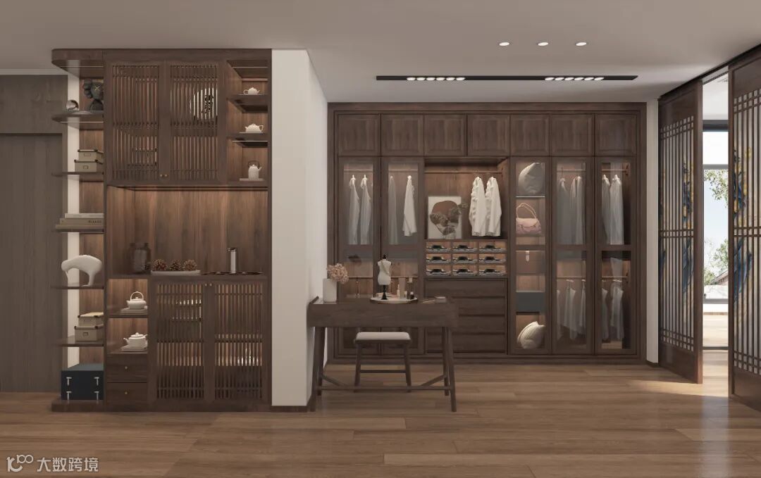 通顶的衣帽间容纳一家人的衣物,温润的木质与玻璃交织,低调自然的艺术美油然而生。设计师利用卧室的入口处空间,打造了一面收纳展示柜,灯光浮现在虚实掩映之间。