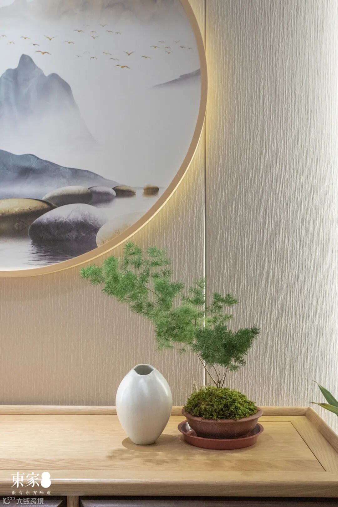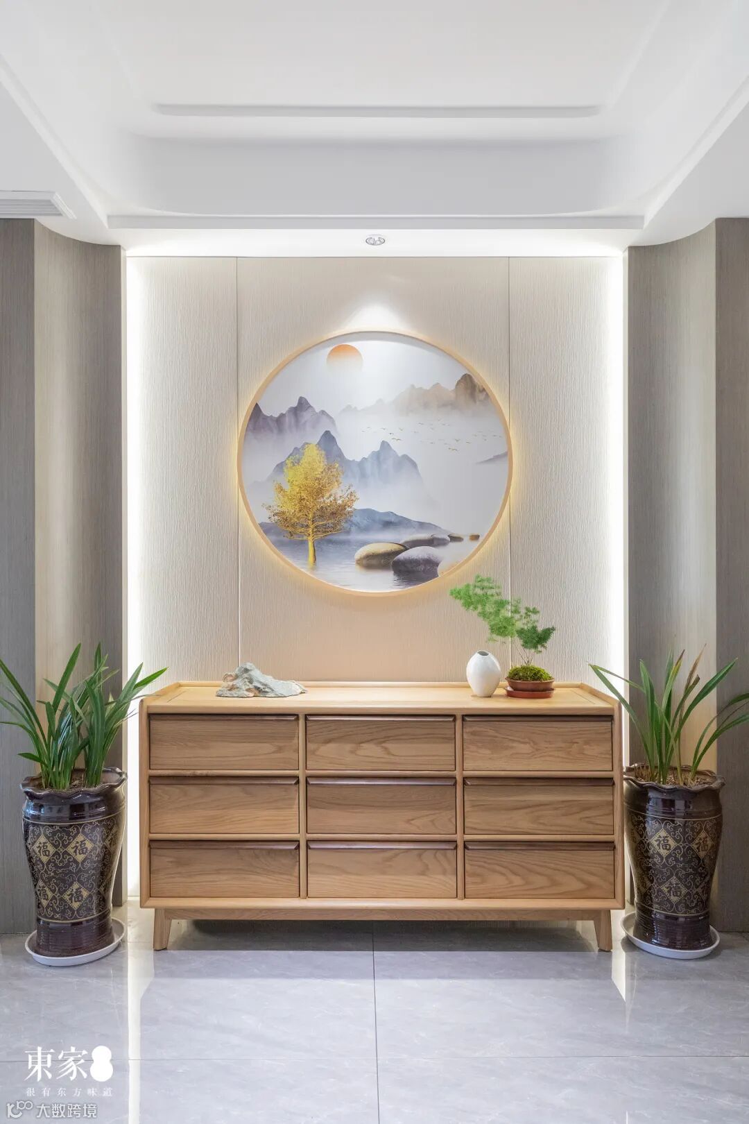玄关处背景墙呈现方形,中心挂以圆形的山水意境画作,暗含着中国人天圆地方的理念,寓意沉稳安定、和谐圆满。原木玄关柜上的山石摆件和绿植,与山水意境情景呼应,展现出纯粹质朴的自然之境。