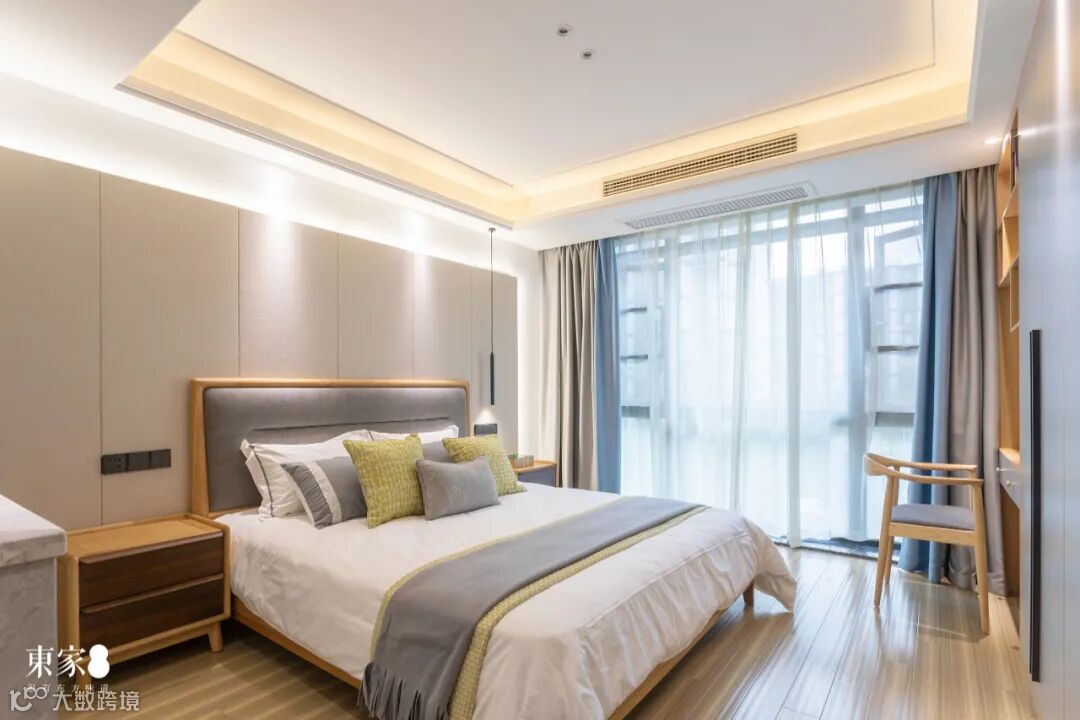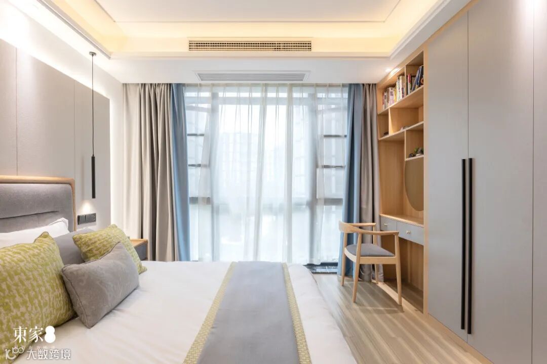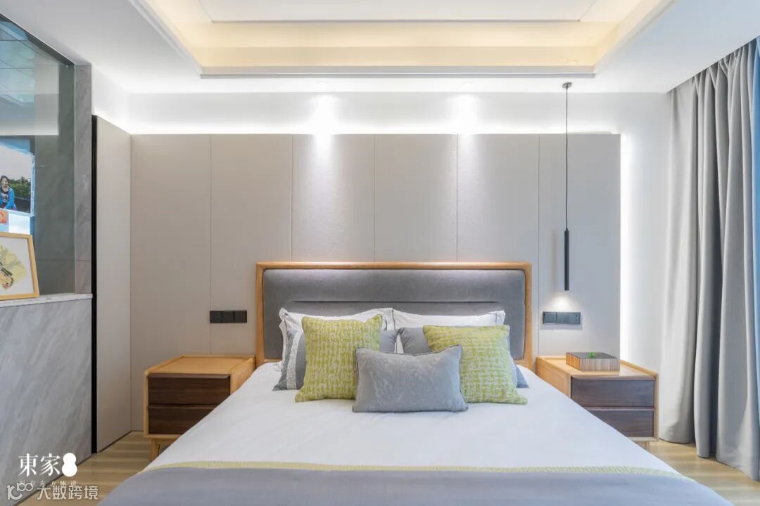 主卧色调与整屋保持一致,布置草绿色的床品,在保持风格统一的同时增添了一份生机盎然的意趣。床头柜多材混搭,黑檀独有的沉静之感让卧室显得更为高级。