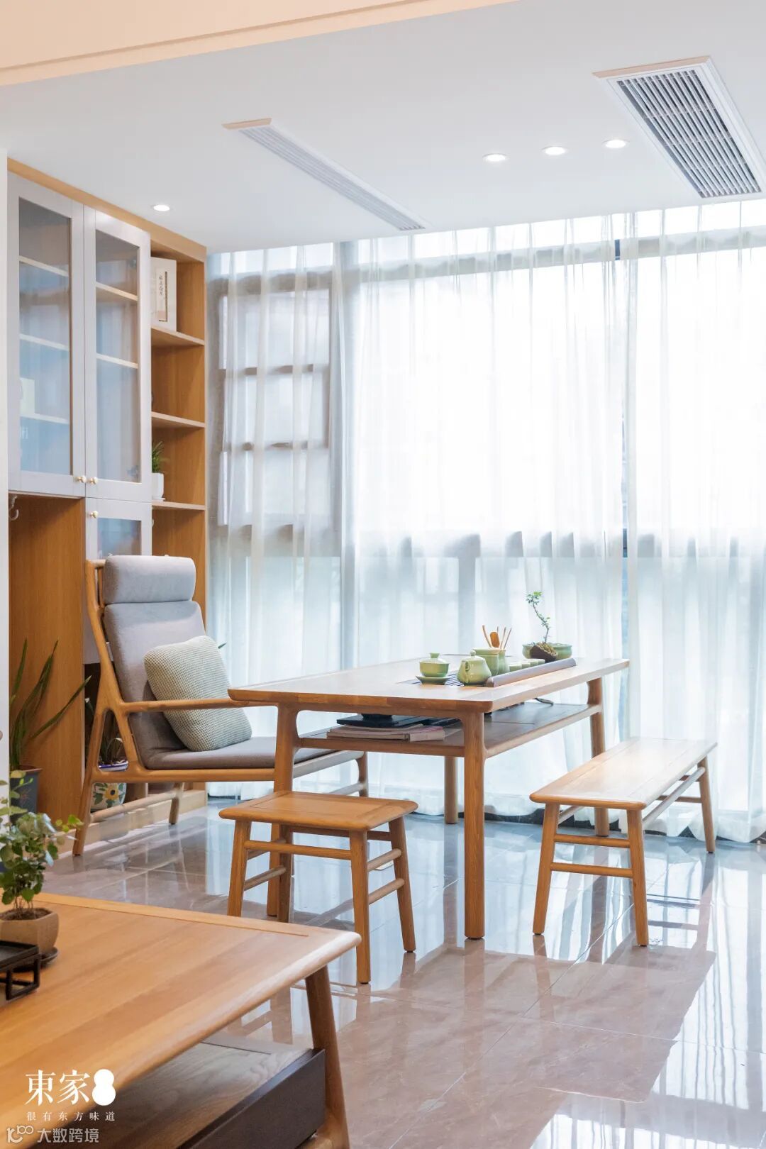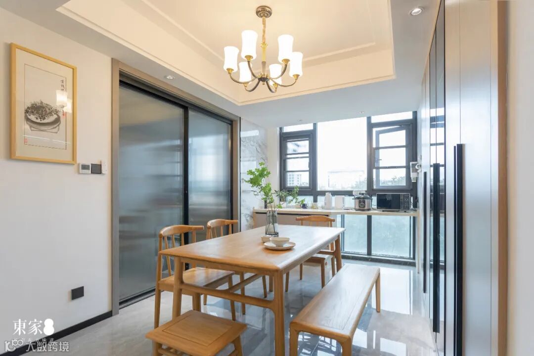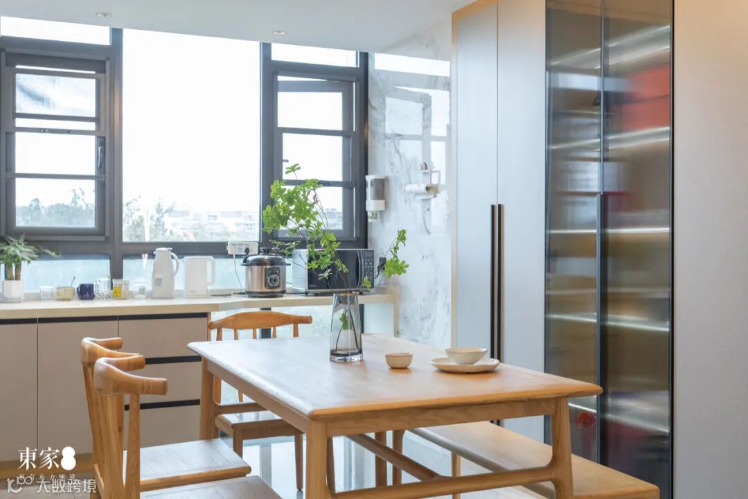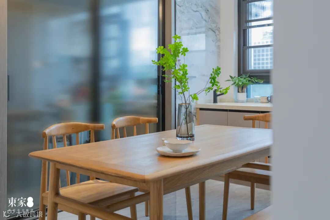 良好的采光,平滑细润的木作质感,有一种置于淳朴田园之境的酣畅闲适之感。靠椅、条凳等满足不同生活方式,随性十足的设计与搭配融合了东方文化与现代生活理念。