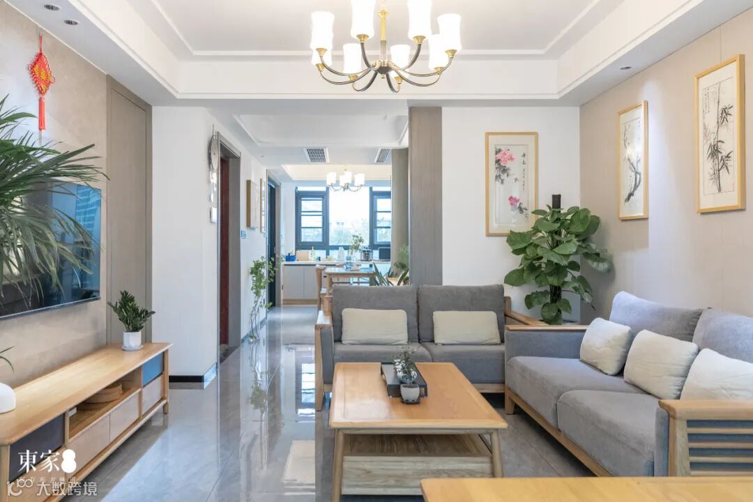客厅是原木色与高级灰的混搭,在现代时尚中融入自然之美,交织相融间完美诠释了天然橡木的兼容性。搭配“梅、兰、竹、菊”四幅挂画和郁郁葱葱的竹叶,以物传情、借景抒情的设计手法,仿佛随时都能感受到大自然的生机以及顽强的生命力。