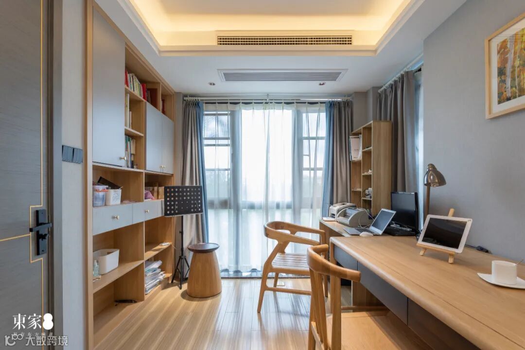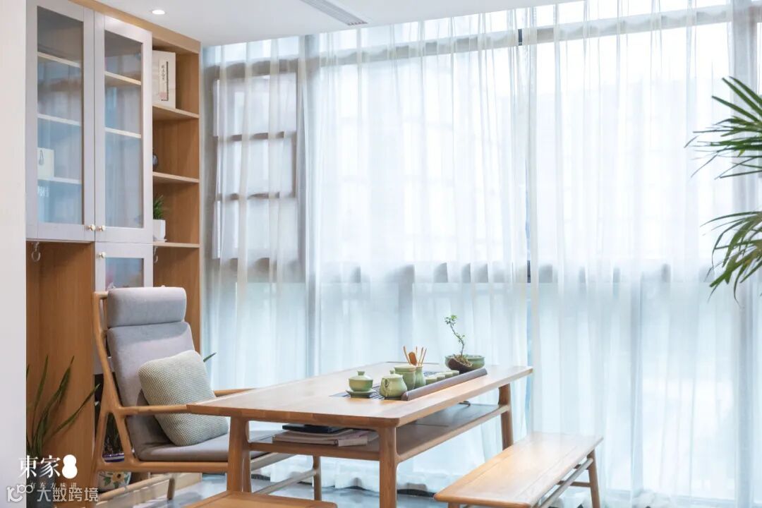 茶室设在落地窗阳台处,使得内外空间相互渗透、融合,视野更为开阔,可将茶境延展到天地之间。淡雅简洁的原木茶台,色彩之平伏,形态之流畅,都赋予了茶室宁静悠远的意境。