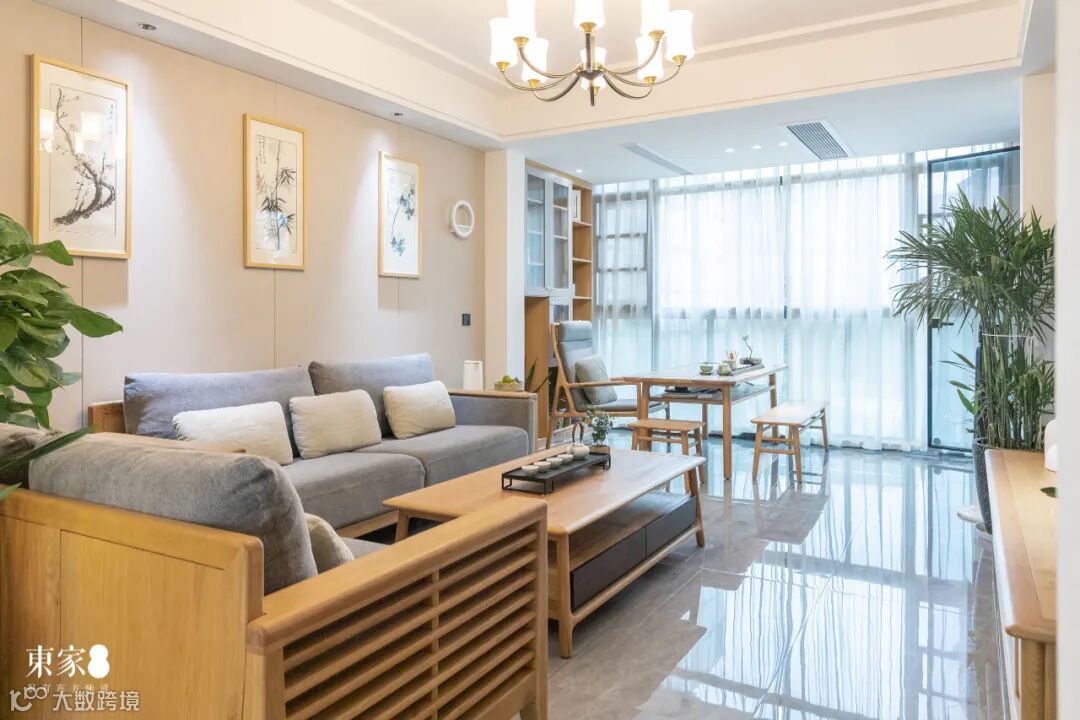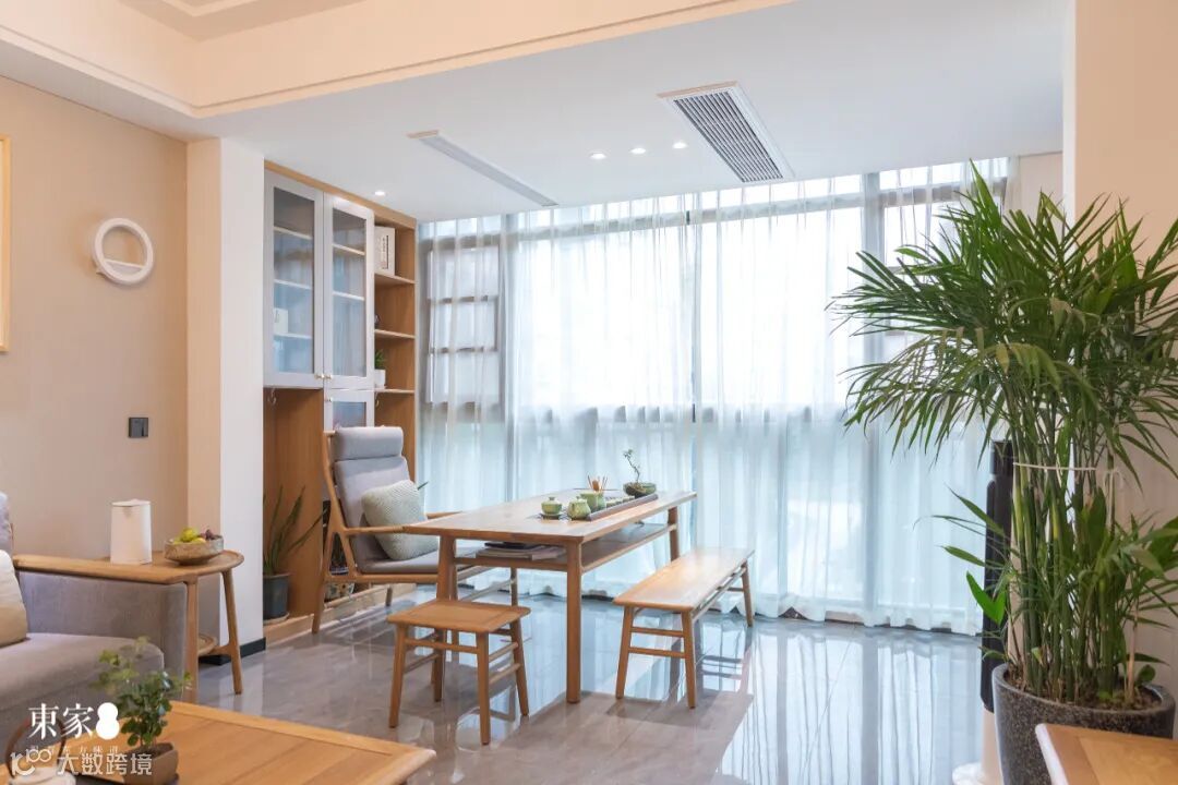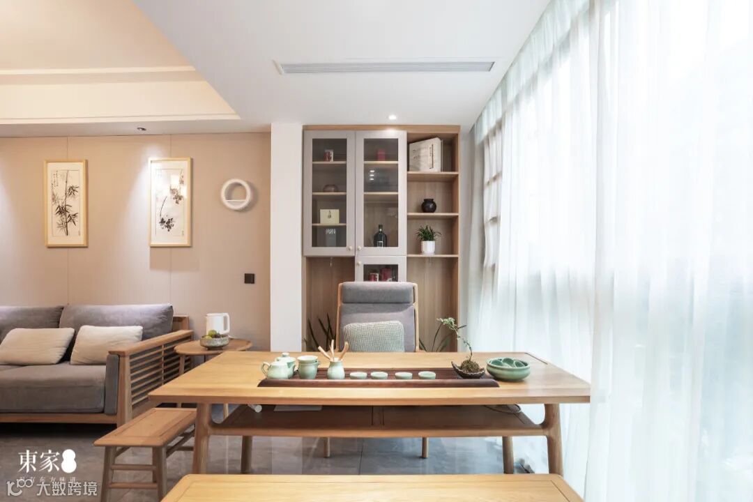 封闭式阳台改造为茶室,与客厅形成一体化的巧妙设计,增加了空间的连通性。空间功能更显饱满充盈,生活会客两不误。