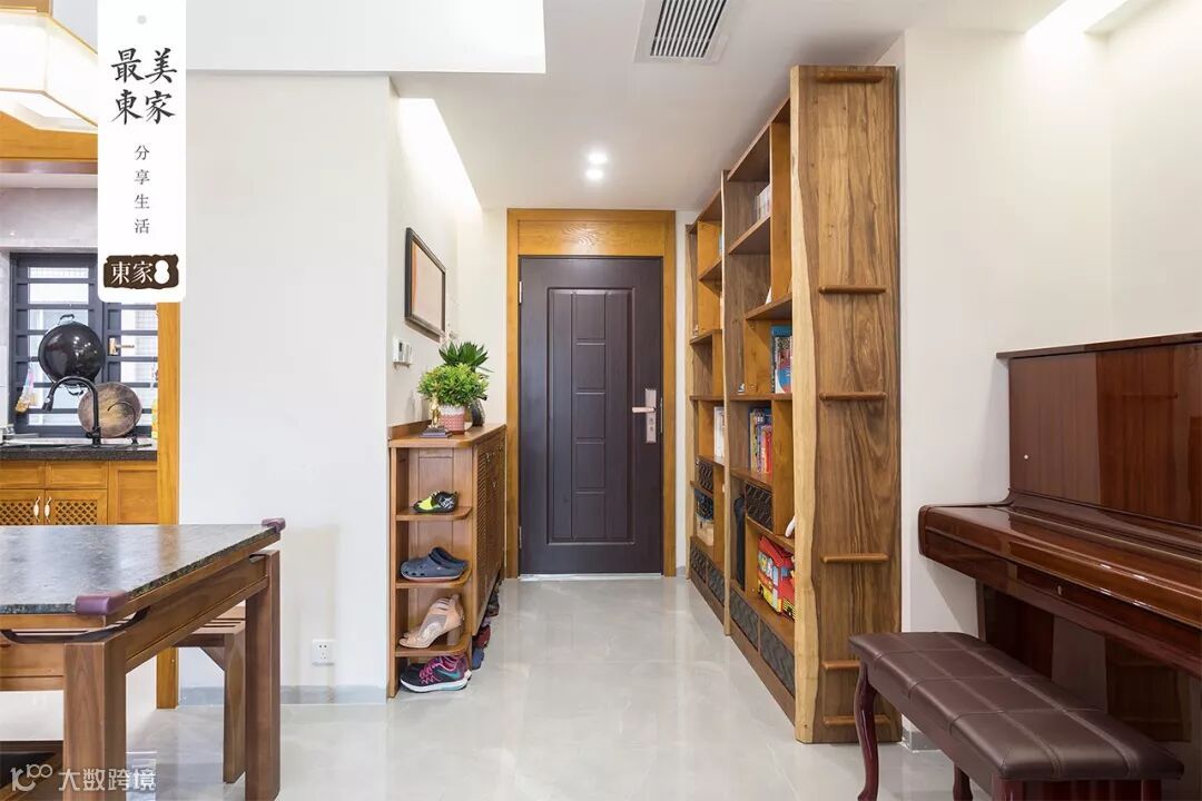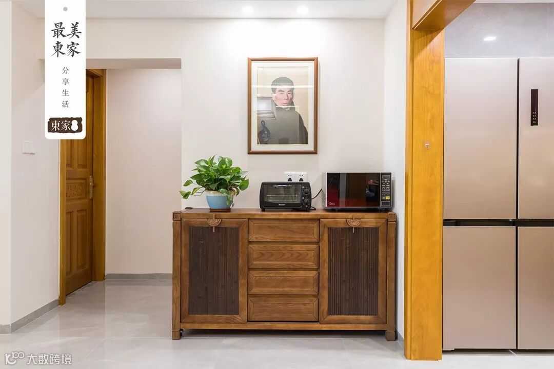 一进门映入眼帘的是高大宽阔的收纳柜,合理的布局规划,可以把小物品分类摆放。我们根据艳姐的家量身定制东家·阿禧的收纳柜,以具有浓厚东方古韵的藤编工艺来点缀空间,营造一个具有东方风情的生活空间。