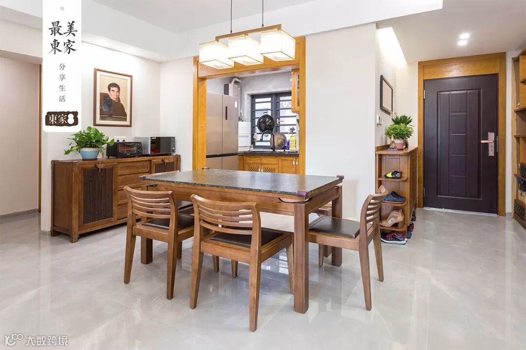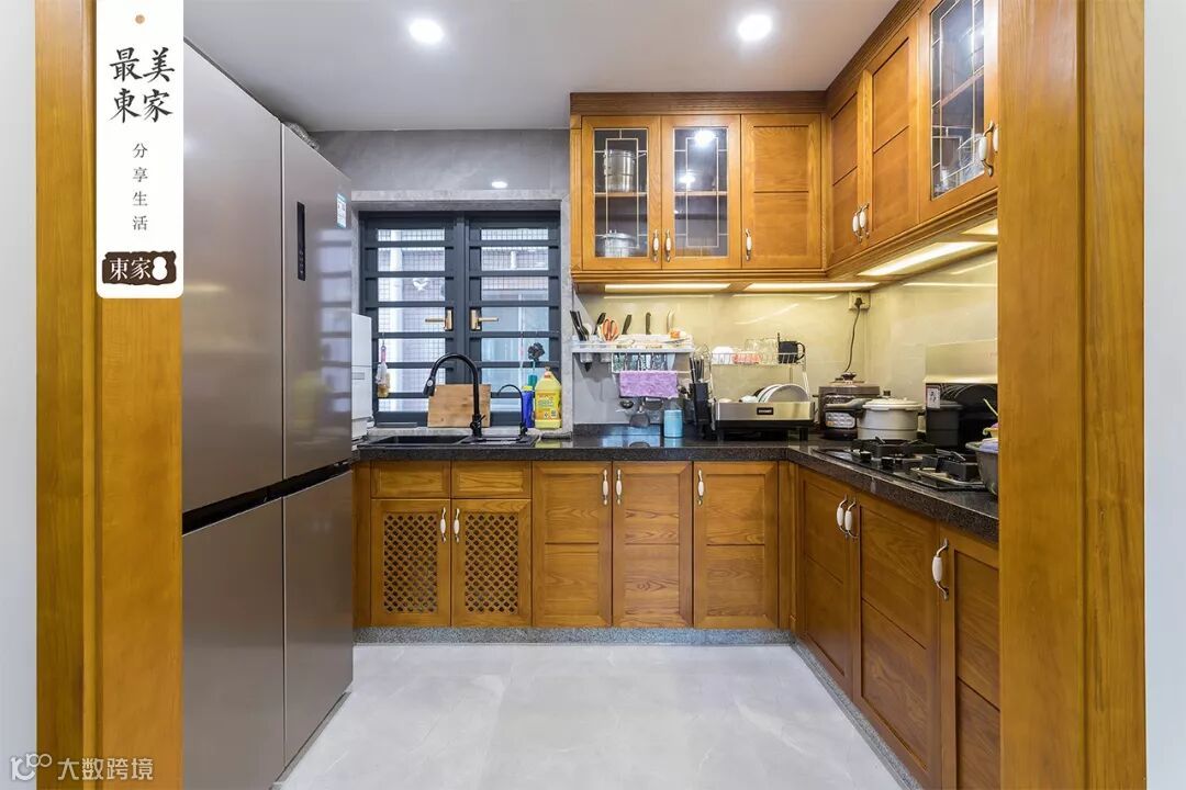 餐厅的对面是温润木色的半开放式厨房,东家·阿禧定制橱柜以地柜和吊柜的方式来满足厨房的收纳需求,橱柜整体的设计还保留着东家家具的低调、内涵及东方神韵,打造一个古风十足、典雅十足的新中式橱柜。
