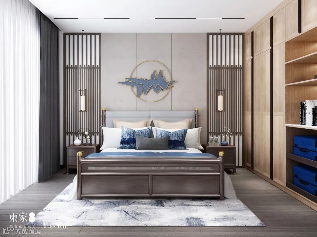 次卧作为老人房,配置不减,床头两侧增加了中式元素的屏风造型与挂饰,软装选择群山装饰与黛蓝色调,让整个空间更为优雅从容。