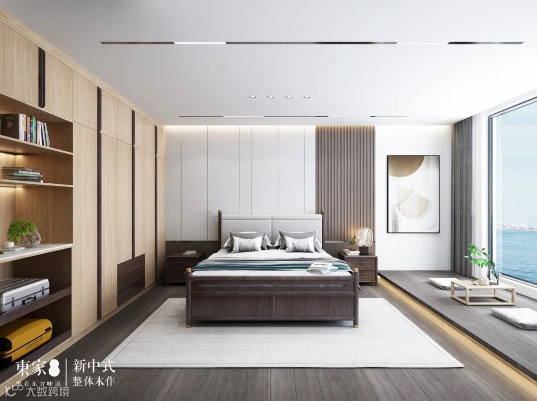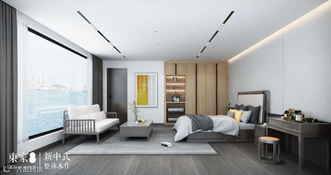 二层的套房都是“主卧级”的配置,半开放式的定制衣柜,集收纳与展示于一体,不仅提供衣物收纳空间,还能摆放书籍与饰品。飘窗的高度刻意降低处理,适合在窗边盘腿打坐,为卧室增添了一丝禅意。