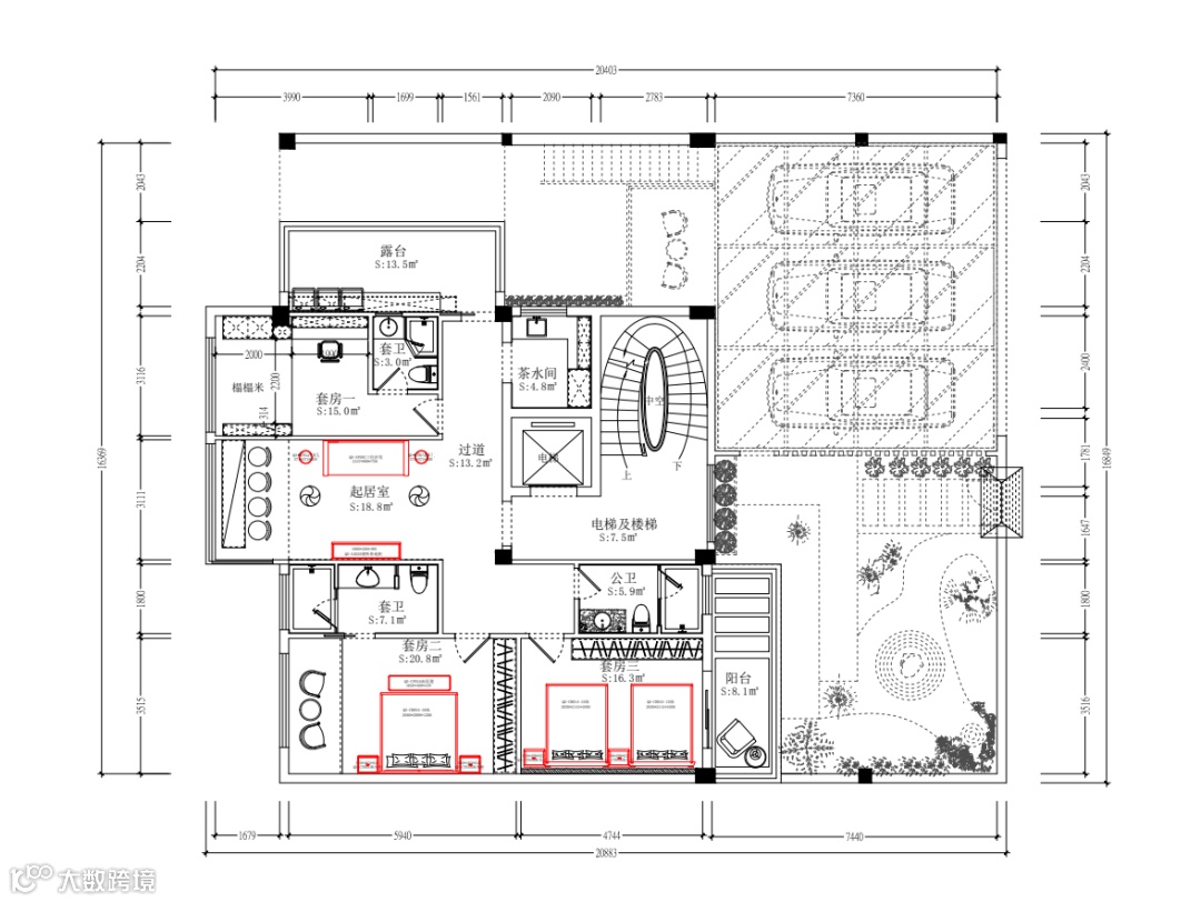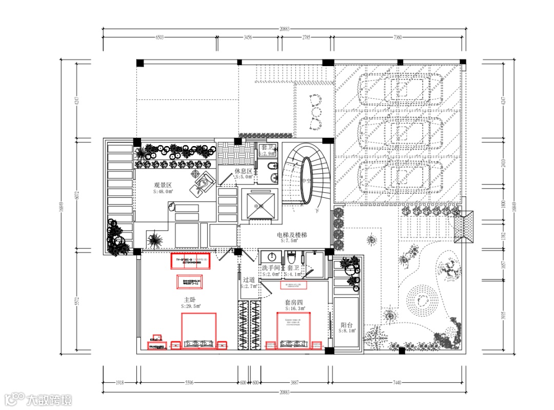 三层的布局分为室外观景区与卧房区,包括主卧与次卧。主卧直通室外观景区,室内也有5米宽的落地窗,躺在床上享受宽幕观景的畅意。茶几沙发梳妆台应有尽有,统一使用了黑檀木材质搭配,彰显主人房的尊贵大气。
