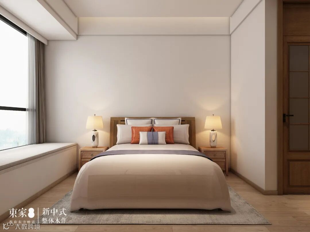 老人房选用大面积留白元素,添加少许的爱马仕橙做视觉跳跃,在宁静安逸的空间中,多了份灵动。
